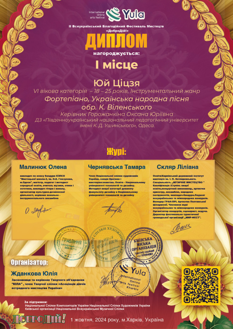 Яскраві перемоги і призові місця здобули студенти кафедри музично-інструментальної підготовки в жовтневих фестивалях-конкурсах мистецтв. Найвищі нагороди Гран-Прі одержали: Антон Колодій - здобувач першого (бакалаврського) рівня освіти, спеціальність 025 Музичне мистецтво у Міжнародному двотуровому фестивалі-конкурсі «Colorful Autumn. STAR WAY 2024» від проєкту «Квітуча Україна», який пройшов за підтримки Міністерства культури та стратегічних комунікацій України в м. Київ та Ву Юйює - здобувачка третього (освітньо-наукового) рівня освіти у Міжнародному фестивалі-конкурсі «Таланти країни» в межах двотурового фестивалю-конкурсу учнівської та студентської творчої молоді «Соняшник» за підтримки Міністерства культури та інформаційної політики України (клас професора Білової Н. К.).