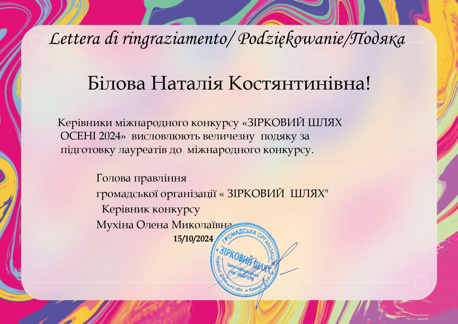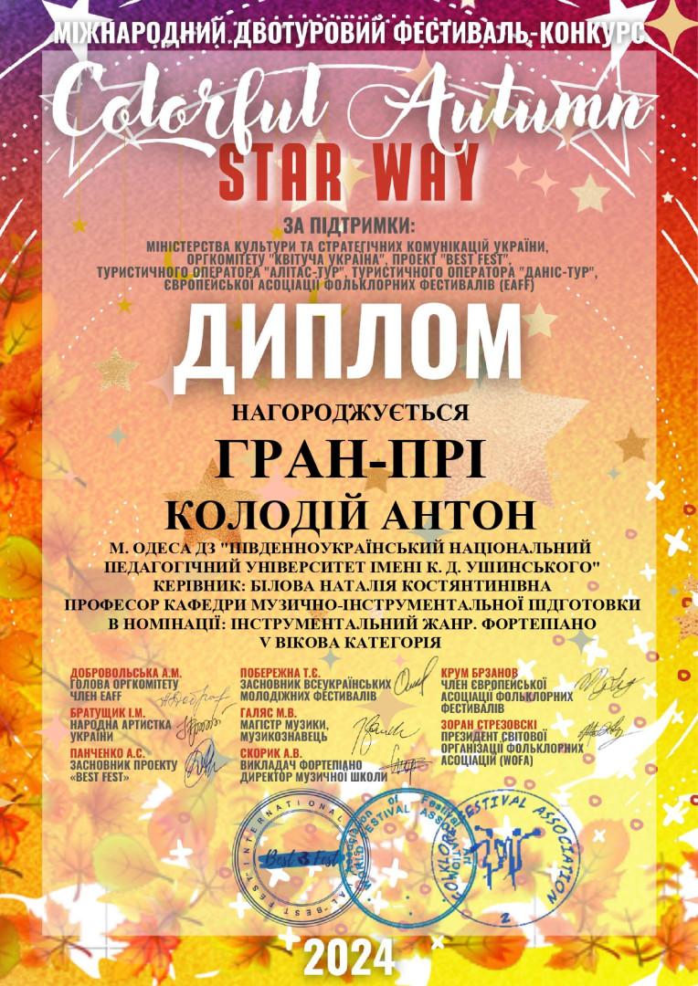 Лауреатами І премії Міжнародного двотурового фестивалю-конкурсу “Colorful Autumn Star way” стали здобувачки першого (бакалаврського) рівня освіти, спеціальність 025 Музичне мистецтво Ніколь Бутенко (клас ст. викл. Мамикіної А. І.) та Чернокунець Марія (клас доцента Левицької І. М.).
