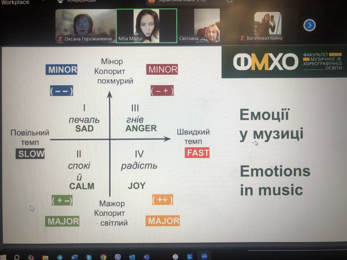 14 листопада 2024 на платформі Zoom на факультеті музичної та хореографічної освіти прйшов семінар - майстер-клас «Музикотерапія та креативність».Автор і ведуча – випускниця факультету, старший викладач вищої категорії КЗПСО «Мистецька школа №12 м. Одеси, автор інноваційної лікувально-навчальної програми «Вокальна терапія у мистецькій школі в умовах війни», Людмила Мазур. В межах заходу було зауважено на актуальні освітні потреби дітей та молоді під час воєнного стану в Україні, представлено методи розвитку емоційного інтелекту засобами музичної терапії та використання когнітивно-поведінкової терапії на уроках музичного мистецтва. У заході взяли участь студенти та викладачі факультету музичної та хореографічної освіти Університету Ушинського, факультету музичного мистецтва Київського національного університету культури і мистецтв, Київського столичний університету імені Бориса Грінченка, Київського державного музичного ліцею імені М. Лисенка, викладачі одеських мистецьких шкіл №№ 1, 2, 3, 4, 5, 11, 12, хорової школи імені С. Крижановського, Одеського палацу дитячої та юнацької творчості «Біла акація», музичних шкіл Шабо, Татарбунар, Шостки, Чернігова.
