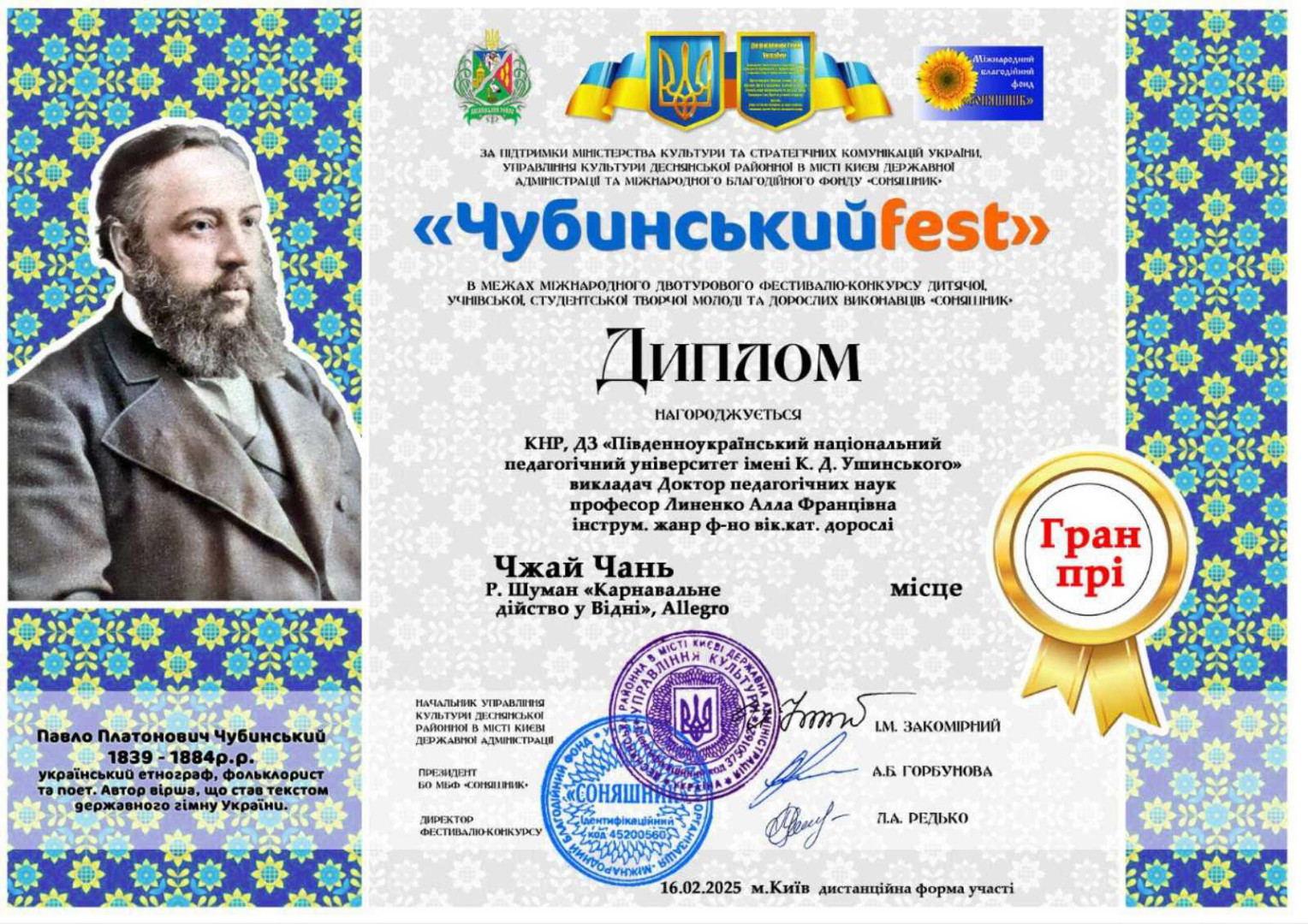 Чжай Чань – Володар Гран-Прі Міжнародного двотурового фестивалю-конкурсу мистецтв «Чубинський Фест», м. Київ, за підтримки Міністерства культури та стратегічних комунікацій України (клас професора Линенко А. Ф.);
