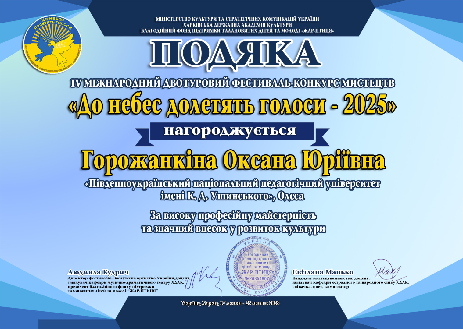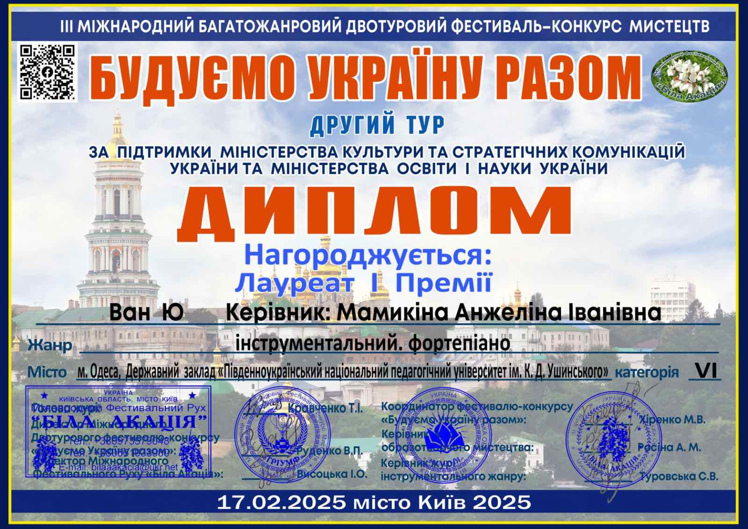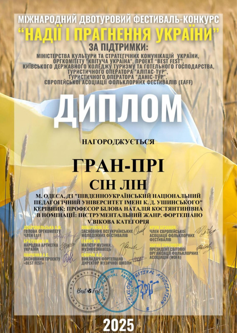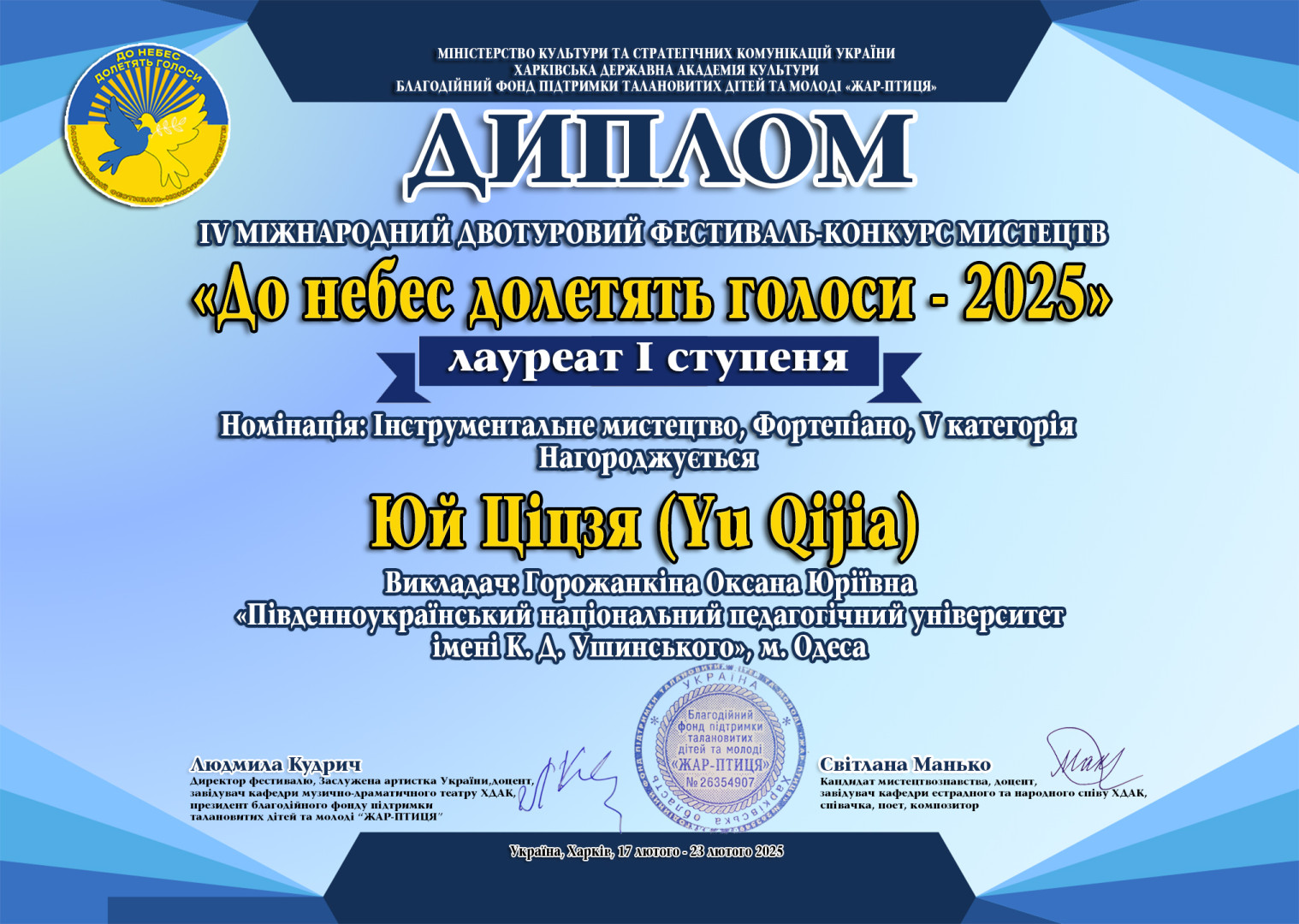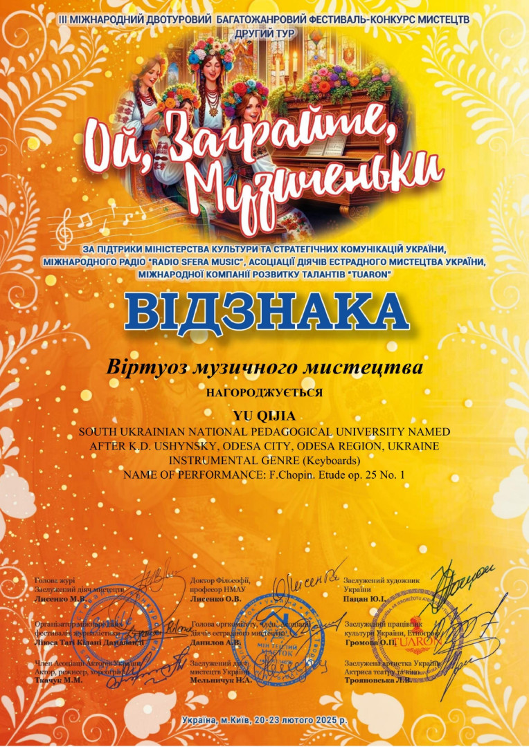 Юй Ціцзя – Лауреат 1 премії ІV Міжнародного двотурового фестивалю-конкурсу мистецтв «До небес долетять голоси - 2025», м. Харків, за підтримки Міністерства культури та стратегічних комунікацій України (клас доц. Горожанкіної О. Ю.);