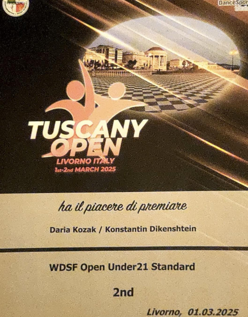 Студенти 2-го курсу факультету музичної і хореографічної освтіи спеціальності 024 Хореографія Костянтин Дікенштейн і Дар'я Козак у складі команди клубу Kolov-MegaDance стали переможцями змагань зі спортивних бальних танців в Італії, Ліворно “TUSCANY OPEN”