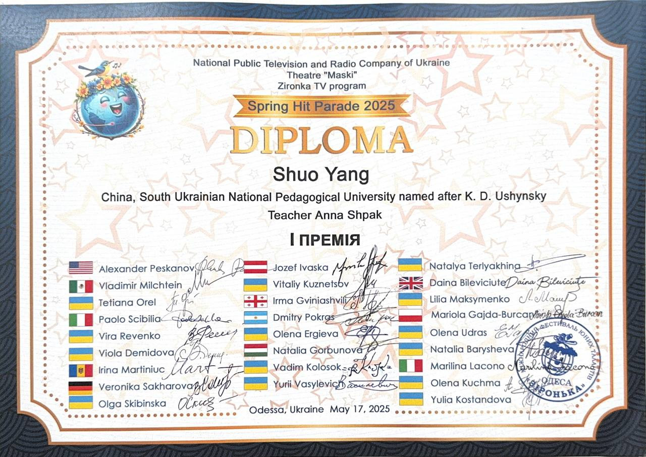 І місце – Ян Шо (здобувач другого (магістерського) рівня, спеціальність 025 Музичне мистецтво, клас викладача Г. К. Шпак);