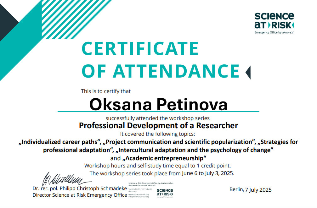 Міжнародна академічна мобільність за програмою професійного розвитку науковців «Professional Development of a Researcher: знайди свою кар’єрну траєкторію в академії та поза її межами» від SCIENCE at RISK Еmergency Оffice akno e.V.» (Берлін, Німеччина) завершена. Впродовж місяця крок за кроком учасники занурювалися у ключові аспекти професійного розвитку науковця: від наукової комунікації та популяризації науки до міжкультурної взаємодії та грантових заявок.