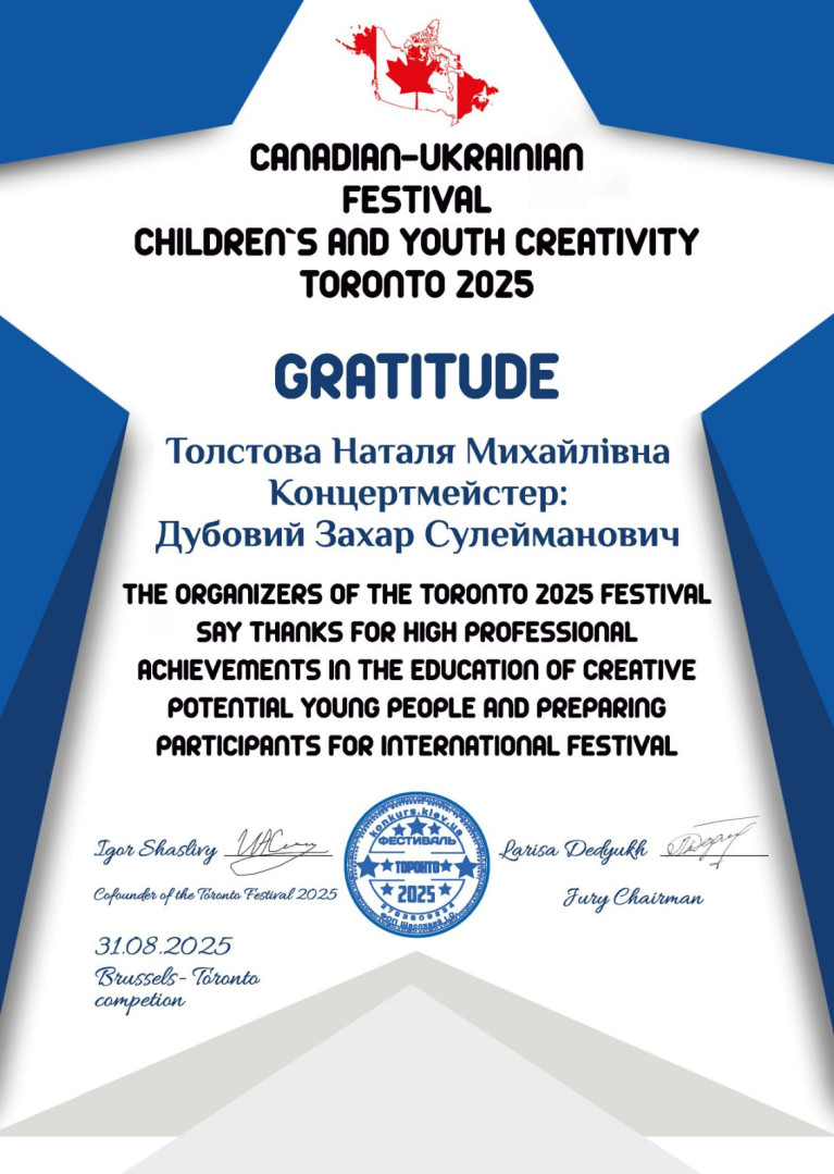 Здобувачка Навчально-наукового інституту музичного і перформативного мистецтва та соціокультурних практик Аріна Семенісова стала лауреатом І премії у номінації «Академічний вокал» на Канадсько-Українському фестивалі «Торонто 2025».
