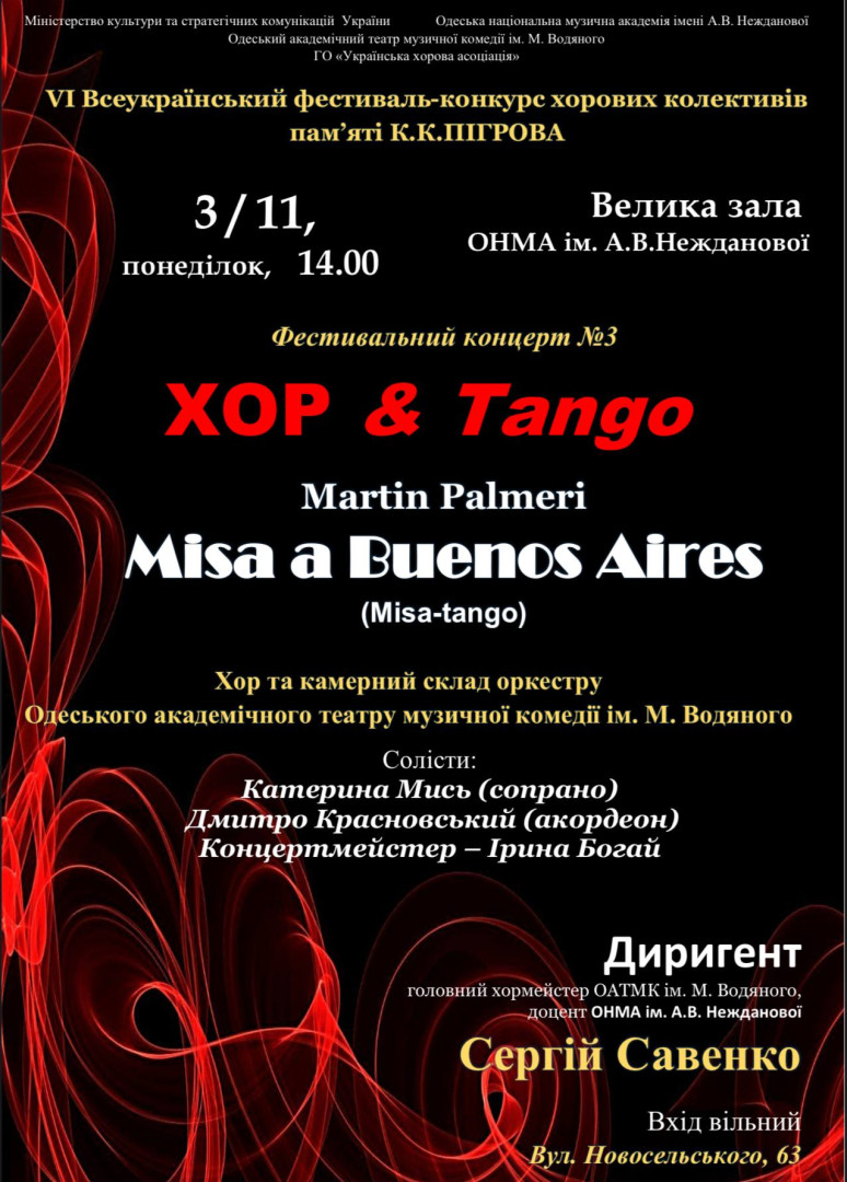 3 листопада 2025 року викладачі та здобувачі ННІМПМСП відвідали концерт хору Одеського академічного театру музичної комедії ім. М. Водяного, який пройшов у великій залі музичної академії імені А. В. Нежданової у межах VІ Всеукраїнського фестивалю-конкурсу хорових колективів пам’яті Костянтина Пігрова. У виконанні хору та камерного складу оркестру Одеського академічного театру музичної комедії імені М. Водяного під керівництвом головного хормейстера театру, доцента ОНМА Сергія Савенка, прозвучала знаменита «Misa a Buenos Aires» (Misa-tango) Мартіна Палмері (Martin Palmeri). Цей експресивний твір поєднує класичну літургію з пристрасними ритмами аргентинського танго. Виконання «Misatango» було відзначене високим професіоналізмом, емоційною насиченістю та глибоким проникненням у стилістику твору. Концерт справив на слухачів глибоке та незабутнє враження і надихнув здобувачів на поглиблене вивчення творів хорового мистецтва, а також на пошук нових, синтетичних форм музичного вираження.