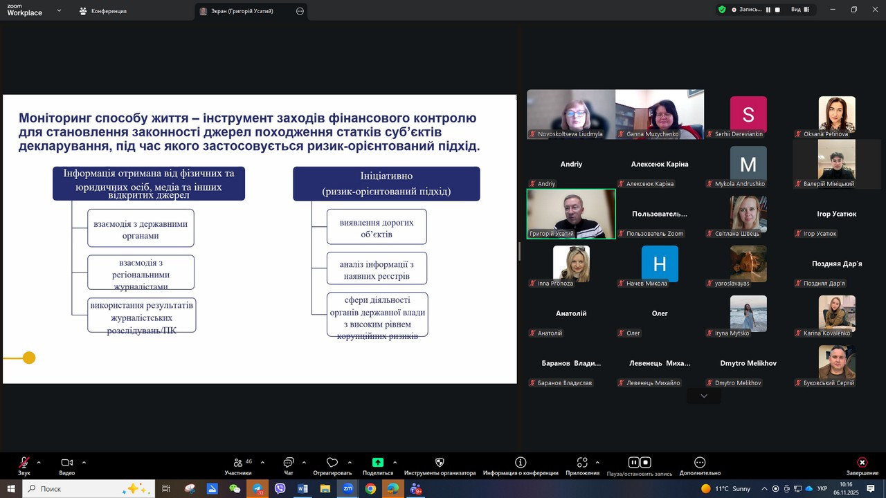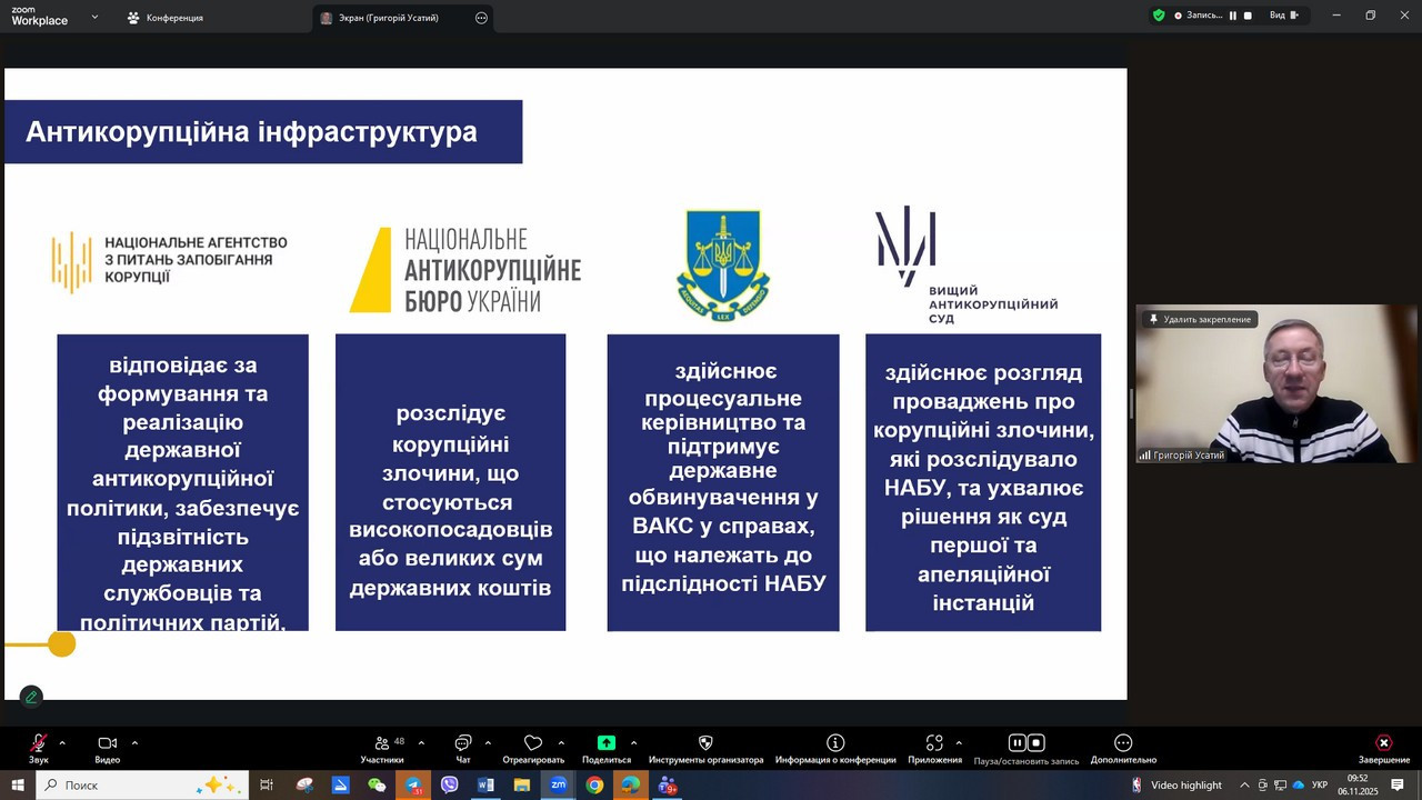 6 листопада 2025 року на запрошення кафедри політичних наук і права науково-педагогічні працівники кафедри, аспіранти ОНП «Філософія» (Ігор Усатюк, Микола Начев, Неля Чабан), магістранти ОНП «Філософія бізнесу та соціокультурних практик» (Анастасія Даниленко, Каміла Калаєва, Павло Козленко) та студенти ОПП «Менеджмент соціокультурної діяльності» (Поздняя Даша, Луцик Ярослава, Денис Будяченко) відвідали відкриту гостьову лекцію на тему «Запобігання корупції в умовах війни: нові досягнення та виклики». Спікером виступив к. ю. н., доцент, заступник керівника відділу реалізації політики у сфері правопорядку Управління реалізації антикорупційної політики у сферах економіки та правопорядку НАЗК – Григорій Усатий, фахівець із практичним досвідом у сфері державного управління. У межах зустрічі було розглянуто напрями діяльності НАЗК, специфіку реалізації антикорупційних практик в умовах воєнного стану, зокрема щодо моніторингу способу життя посадових осіб, а також досягнення України у сфері запобігання та протидії корупції. Особливу увагу лектор приділив значенню просвітницької та освітньої діяльності агентства – створенню сучасних навчальних продуктів у форматі неформальної освіти для публічних службовців і громадян. Також наголошувалося на важливості міжсекторальної взаємодії – співпраці з громадськими організаціями, освітніми закладами та медіа з метою формування культури доброчесності та прозорості в суспільстві. Подія засвідчила актуальність антикорупційної освіти як складової професійних і громадянських компетентностей сучасних здобувачів вищої освіти.