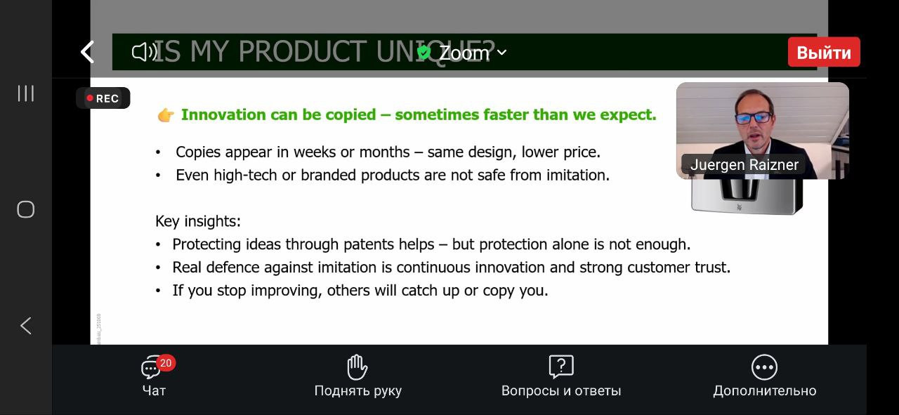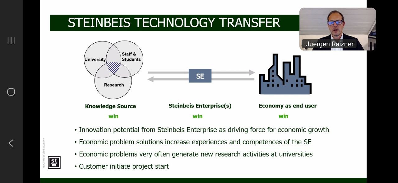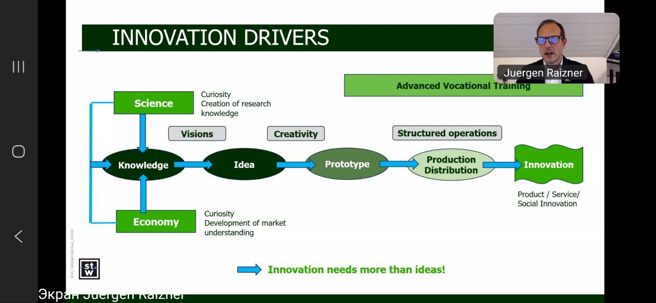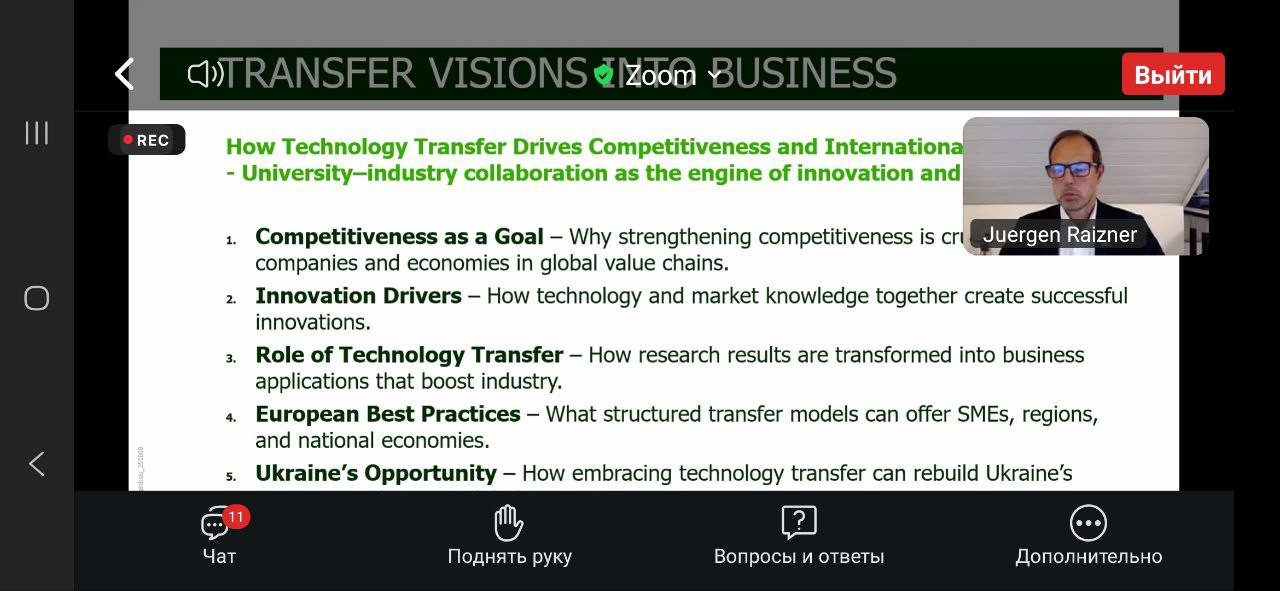 В межах ОК «Філософія бізнесу та соціокультурних практик» здобувачі другого (магістерського) рівня вищої освіти ОНП «Філософія бізнесу та соціокультурних практик», а також першого (бакалаврського) рівня вищої освіти ОПП «Менеджмент соціокультурної діяльності» 4 року навчання (викладач – проф. Петінова О. Б.) відвідали онлайн-семінар директора Steinbeis Enterprises, експерта із трансферу технологій та міжнародної співпраці Юргена Райцнера на тему «Трансформація ідей у бізнес: як трансфер технологій сприяє конкурентоспроможності та міжнародній співпраці», що проходив на міжнародній освітній платформі Ukraine Global Faculty 10 листопада 2025 року. У контексті філософії бізнесу та соціокультурних практик зустріч акцентувала увагу на тому, що технологічні інновації – це не лише економічний інструмент, а й ціннісний процес, який формує культуру взаємодії між наукою, підприємництвом і суспільством. Такий підхід поєднує етику, креативність і соціальну відповідальність бізнесу, створюючи підґрунтя для сталого розвитку. У філософії бізнесу трансфер технологій розглядається не лише як економічний процес, а як ціннісна взаємодія, що формує нову культуру інновацій і відповідального підприємництва. Аналізували кращі європейські практики, а також можливості для України: як впровадження технологічного трансферу може стати соціокультурною практикою відновлення, поєднуючи економічне зростання з розвитком людського потенціалу та інноваційного мислення. В обговоренні проблематики взяли активну участь Павло Козленко та Анастасія Даниленко. Такі зустрічі з міжнародними експертами-практиками мають важливе значення для здобувачів освіти, адже сприяють поєднанню теоретичних знань із реальним досвідом сучасного бізнесу, науки та міжнародного партнерства. Вони формують у студентів критичне мислення, навички міждисциплінарного аналізу та розуміння глобальних тенденцій розвитку інновацій. Спілкування з практиками допомагає усвідомити роль філософії, етики та соціальної відповідальності у бізнесових процесах, розвиває компетентності лідерства, комунікації та креативності, необхідні для участі у трансформаційних процесах сучасного суспільства. Подібні заходи сприяють інтеграції академічного середовища у міжнародний простір інновацій та сталого розвитку.