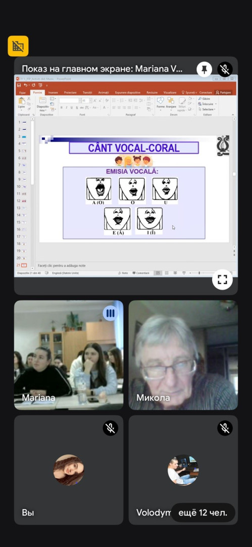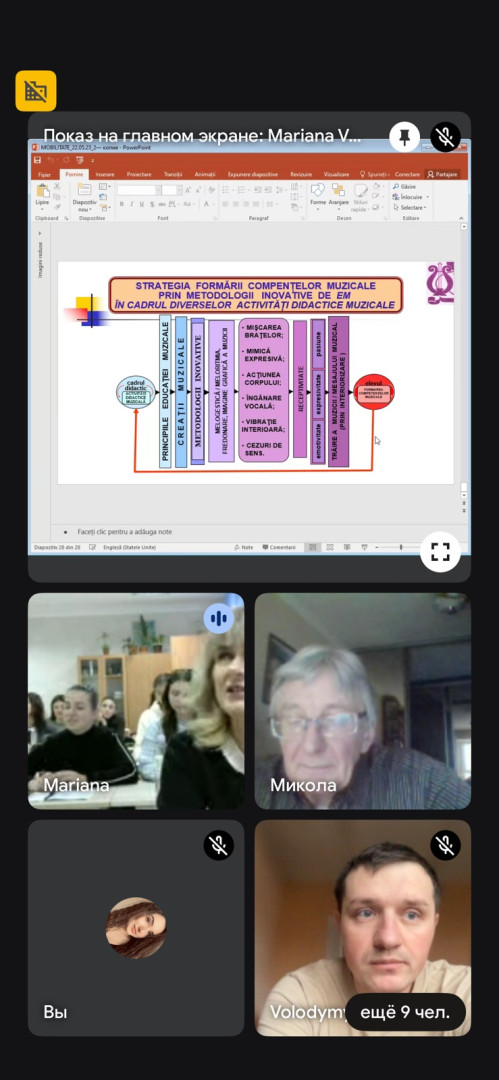 Учасники академічної мобільності були залучені до цікавих форм лабораторних занять на тему: Інноваційні методи навчання музики (ilustrarea metodelor specifice educaţiei muzicale generale). Викладач – доцент Маріанна Вакарчук. У заняттях брали участь здобувачі першого рівня вищої освіти: О.Гребенюк, Ю. Гордійчук, А.Казанжі, К.Чорна, А. Тищенко, Юй Мяо; аспіранти: Ю.Дереновська, В.Слободянюк, Лянь Вейхун, Чень Цзюньжу, Чень Сяоюй, Шао Ці.