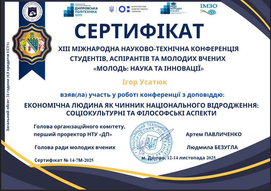 12–14 листопада 2025 року відбулася ХІІІ Міжнародна науково-технічна конференція студентів, аспірантів та молодих учених «Молодь: наука та інновації» (м. Дніпро), до якої на запрошення ЗВО-партнера НТУ «Дніпровська політехніка» долучилися здобувачі вищої освіти нашого університету, в тому числі аспіранти ОНП «Філософія» Неля Чабан, Сергій Карастан, Микола Начев, Ігор Усатюк, Віолета Світлицька, а також члени студентського наукового гуртка «Південноукраїнські наукові студії» (керівник – проф. Оксана Петінова) – Оксана Базелюк, Аліна Шмаленко, Каріна Мусіхіна, Дарина Іскра та інші. Цей захід став важливою платформою для академічного зростання молодих дослідників та обміну науковими ідеями в умовах сучасних суспільних трансформацій. Участь у конференції сприяла презентації наукових результатів та розвитку дослідницької культури й академічної комунікації учасників. У межах секції № 14 «Гуманітарні науки» представлено широкий спектр тем, що відображають актуальні соціокультурні, філософські, педагогічні та економічні виклики сучасності. Зокрема, студентські та аспірантські доповіді були присвячені проблемам формування громадянсько-патріотичної позиції, трансформації ціннісних орієнтацій, ролі мистецтва метамодерну, впливу війни на демократичні практики та соціалізацію особистості, розвитку демократичного освітнього середовища, креативного підприємництва й педагогічних стратегій підтримки молоді в умовах кризи. Проведення конференції ще раз підтвердило, що наукові заходи такого формату є важливим середовищем професійної соціалізації студентів і аспірантів, сприяють розвитку наукової ініціативи, академічної доброчесності та формуванню активної дослідницької позиції молоді.