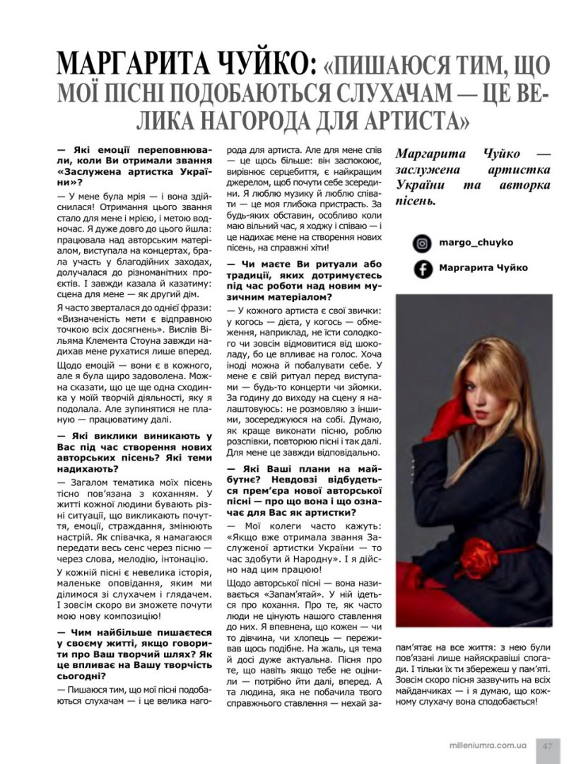Маргарита каже: «Пишаюся тим, що мої пісні подобаються слухачам – велика нагорода для артиста». А ми пишаємося тим, що така талановита дівчина навчалася в нашому Університеті Ушинського, вона стала справжнім амбасадором нашої української пісні, її автором, виконавцем. Вона співає не лише в Україні, а й за її межами. Дає інтерв’ю відомим зарубіжним журналам: «OPIUM», «MILLENIUM BUSINESS» та ін. Її найкращі пісні-композиції «Запам’ятай», «Пожежа» - стали творчою візитівкою «Посла культурної дипломатії».