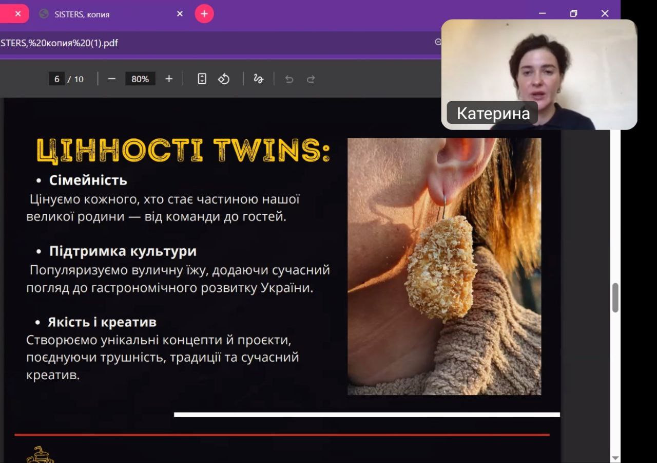 На запрошення к. філос. н. Катерини Ткаченко в межах вивчення навчальної дисципліни «Основи підприємництва» відбулася зустріч з експертом-практиком, засновницею проєкту Twin Sisters Катериною, підприємицею з понад 18-річним досвідом у сфері HoReCa та фестивальної культури на тему «Бізнес як культурний продукт: їжа, бренд і спільнота», що стала методологічною рамкою для осмислення підприємництва як форми культуротворення. У фокусі обговорення розуміння бізнесу не лише як економічної діяльності, а як простору формування сенсів, соціальних зв’язків і міської ідентичності. Підприємництво розглядалось як інтегративний феномен, що поєднує економічні, соціальні та культурні виміри. Спікерка поділилися практичним досвідом створення та розвитку гастрономічних брендів «Чуросна», «Manuela» та «Twins Bar», розкривши бізнес не лише як економічну модель, а як культурний продукт, що формує спільноту, цінності та міську ідентичність. Зустріч стала прикладом поєднання теоретичних засад підприємництва з реальними кейсами функціонування малого та середнього бізнесу в креативних індустріях. Особливу увагу було приділено питанням: формування бренду як соціокультурного феномену, жіночого лідерства у підприємницькому середовищі, ролі гастрономії у створенні культурного простору міста, побудови спільнот навколо бізнес-проєктів. До зустрічі також доєдналися здобувачі 1-го року навчання разом із викладачкою ОК «Теорія і практика презентації проєктів» проф. Оксаною Петіновою, адже представлений кейс став прикладом практичного застосування теоретичних засад проєктної комунікації, сторітелінгу та публічної репрезентації ідей. Аналізуючи досвід створення та розвитку гастрономічних брендів, здобувачі мали можливість простежити, як формується цілісна презентація проєкту – від концептуальної ідеї та ціннісної пропозиції до візуалізації, комунікаційної стратегії та взаємодії з цільовою аудиторією. Зустріч дозволила осмислити бренд як проєктний наратив, у якому презентація виступає не лише інструментом просування, а способом конструювання сенсів, довіри та спільноти. Практичний досвід спікерки продемонстрував важливість уміння презентувати бізнес-проєкт у соціокультурному контексті, адаптувати повідомлення до різних аудиторій та вибудовувати комунікацію, що поєднує економічну доцільність із культурною місією.