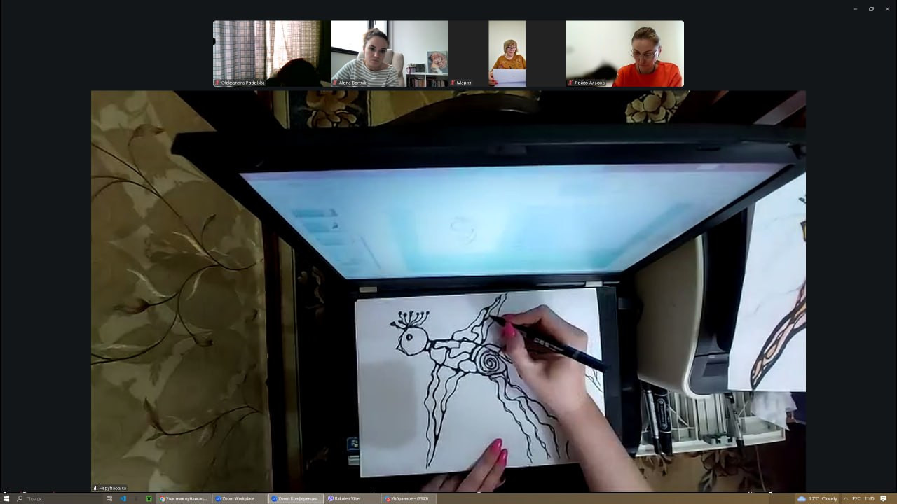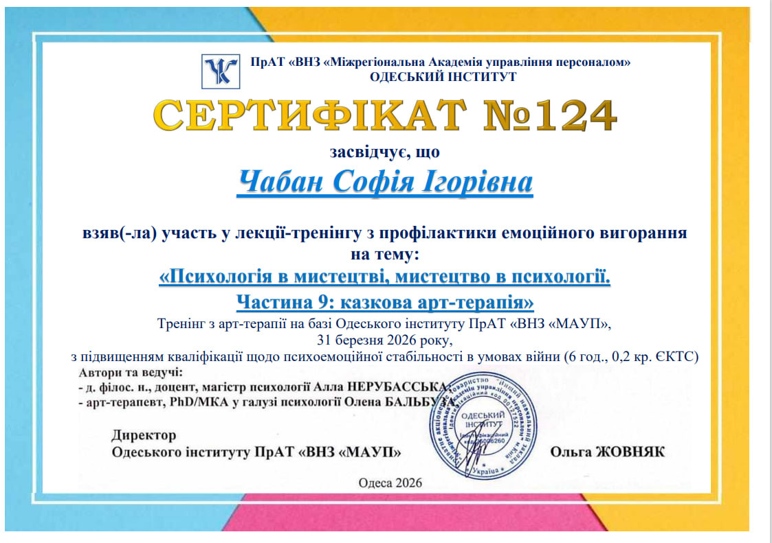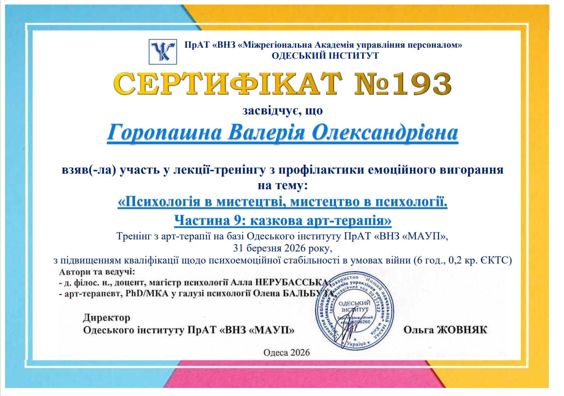 Друга частина – практична – передбачала участь у професійному тренінгу Одеського інституту ПрАТ «ВНЗ «МАУП» на тему: «Психологія в мистецтві, мистецтво в психології. Частина 9: казкова арт-терапія». Всі учасники заходу разом із Гарантом ОНП проф. Петіновою О. Б. долучилися до майстер-класу з казкотерапії та нейрографічного малювання, що сприяло емоційному розвантаженню, відновленню внутрішніх ресурсів і формуванню навичок саморегуляції.