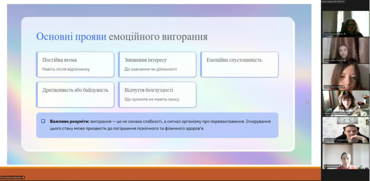 У межах проходження науково-педагогічної практики аспірантом ОНП «Філософія» Миколою Начевим зі студентами 1 курсу ОПП «Менеджмент соціокультурної діяльності», членами гуртка «Південноукраїнські наукові студії» було проведено виховний захід на тему «Емоційне вигорання та стрес: сутність, причини та профілактика». Захід поєднав теоретичний і практичний компоненти, що забезпечило його цілісність, змістовність та високий рівень залученості студентів. Перша частина – теоретична – була спрямована на розкриття природи стресу як адаптаційного механізму та осмислення емоційного вигорання. Проаналізовано етапи формування вигорання, його прояви та ризики в професії менеджера соціокультурної діяльності. З метою активізації навчальної взаємодії використані інтерактивні методи: міні-дискусії, робота в малих групах, аналіз кейсів, мозковий штурм щодо стратегій профілактики, а також рефлексивні вправи на усвідомлення власного емоційного стану та ресурсів. Це сприяло розвитку критичного мислення, емпатії та навичок саморефлексії у студентів.