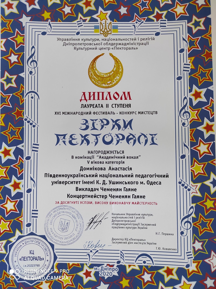З 15 по 17 червня 2020 року в Дніпрі пройшов XVI Міжднародний фестиваль-конкурс мистецтв «Зірки Пекторалі». В номінації «Академічний вокал» лауреатом ІІ ступеню стала студентка факультету музичної та хореографічної освіти Анастасія Домнікова (клас викл. Чеменян Г.П.).