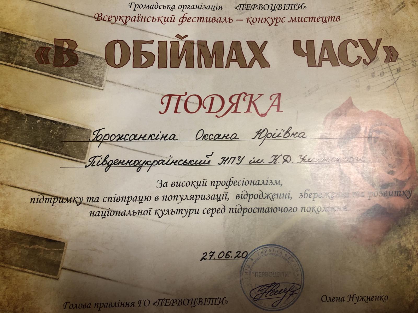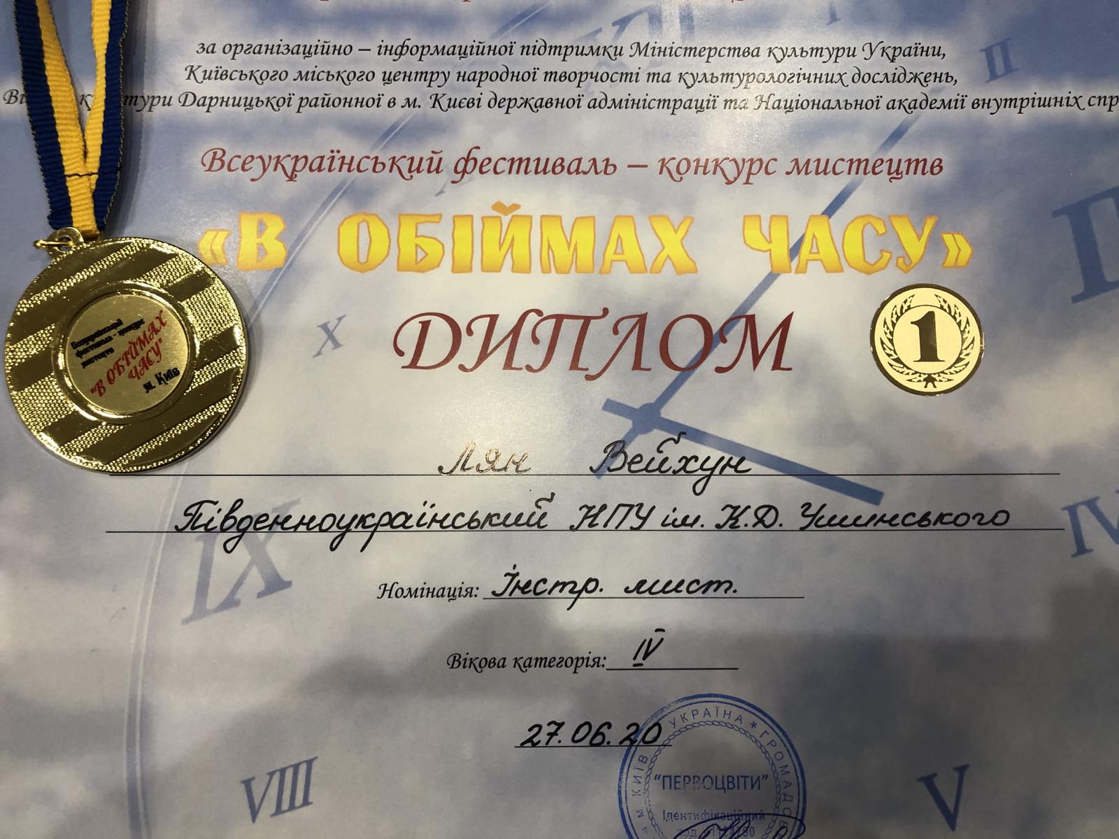 Студент факультету музичної та хореографічної освіти Університету Ушинського Лян Вейхун став лауреатом І премії Всеукраїнського фестивалю-конкурсу мистецтв "В ОБІЙМАХ ЧАСУ" в номінації «Інструментальне мистецтво». Конкурс пройшов 27 червня 2020 р. за підтримки Міністерства культури України в м. Київ.
