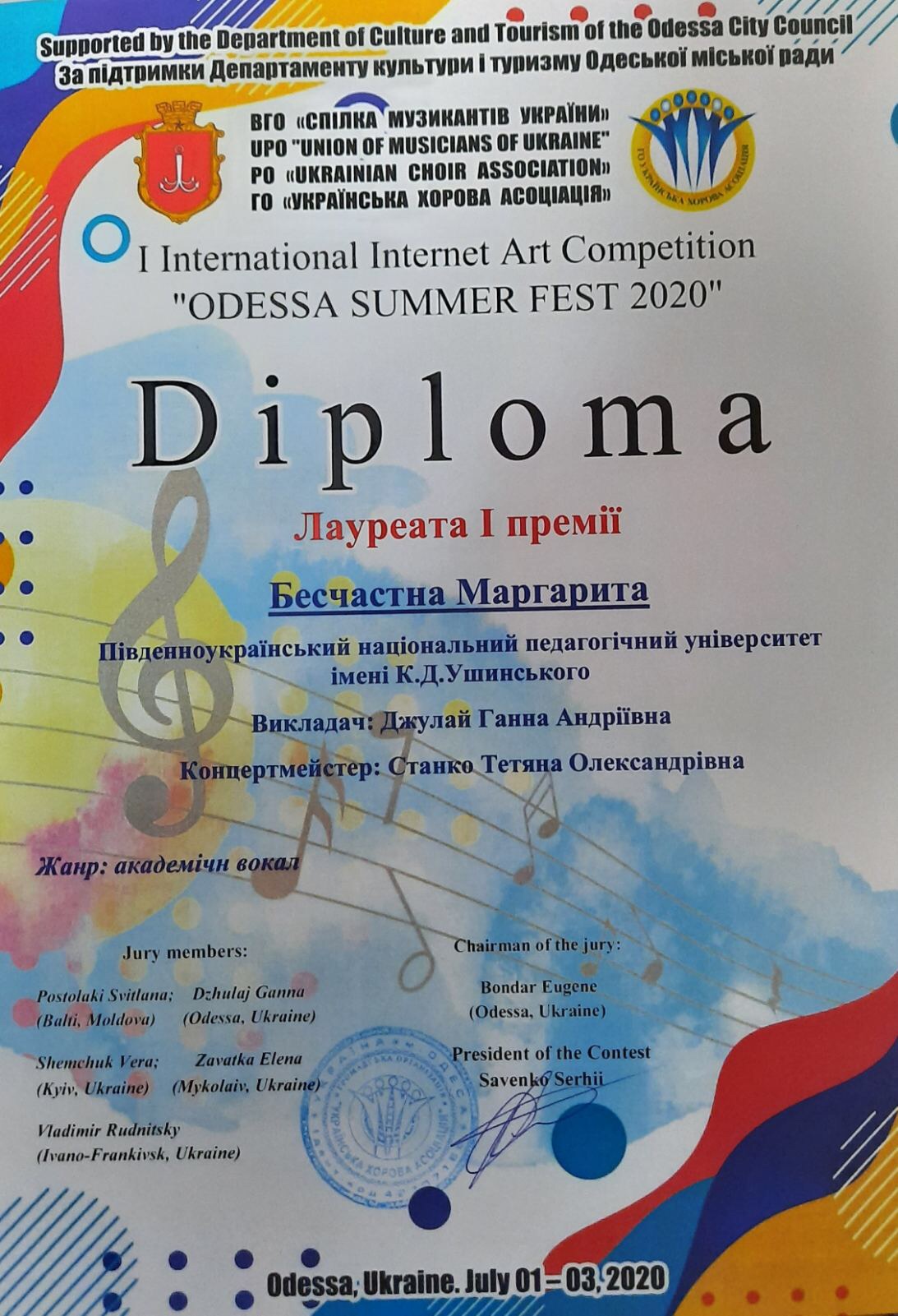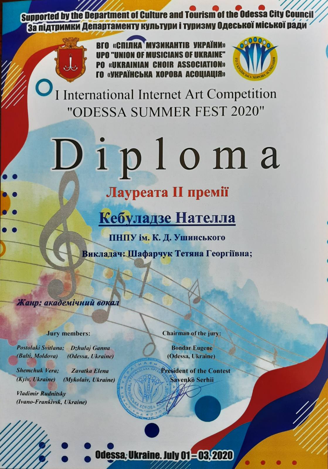 Вітаємо студентів факультету музичної та хореографічної освіти з успішним виступом на І Міжнародному фестивалі мистецтв «Summer Fest Odessa 2020», який проходив з 1 по 3 липня. В номінації «Академічний вокал» лауреатами І премії стала Маргарита Безчастна (клас доц.. Джулай Г.А.) та Лю Сяомей (клас ст. викл. Шафарчук Т.Г.). ІІ місце посіла Нателла Кебуладзе (клас ст. викл. Шафарчук Т.Г.). В номінації «Інструментальний жанр» звання лауреата ІІ премії одержав Юрій Данільченко (клас ст.викл. Десятнікової Н.Л.).