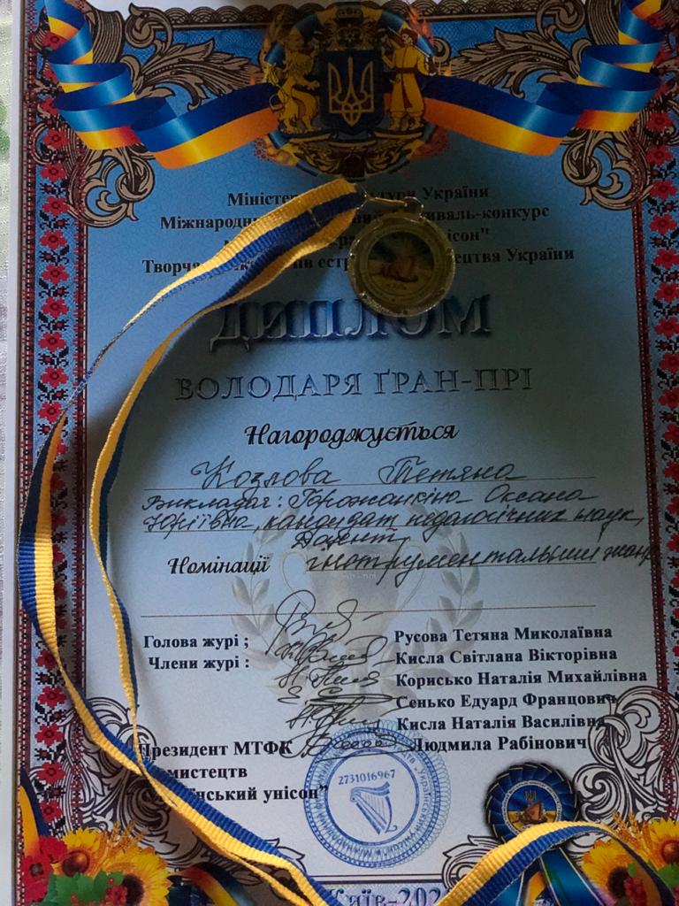 Володарем Гран-Прі фестивалю-конкурсу в номінації «Інструментальний жанр» стала студентка факультету музичної та хореографічної освіти Тетяна Козлова (клас доцента Горожанкіної О.Ю.).