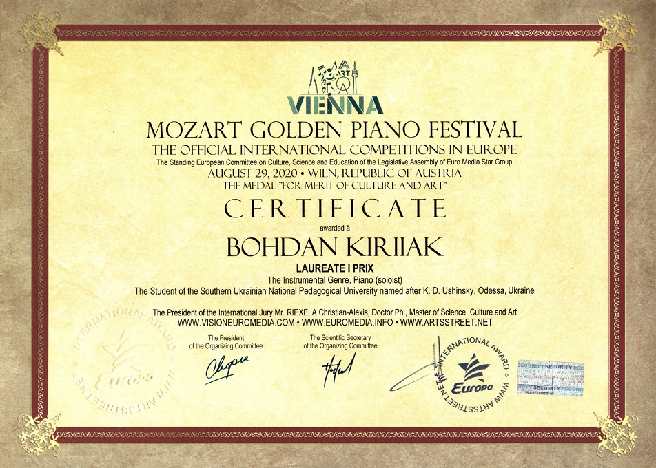 Студент факультету музичної та хореографічної освіти Богдан Кирияк здобув чергову перемогу – звання лауреата І ступеню на Міжнародному фестивалі «Мozart golden piano festival», який пройшов в м. Відень (Австрія) 29 серпня 2020 року.