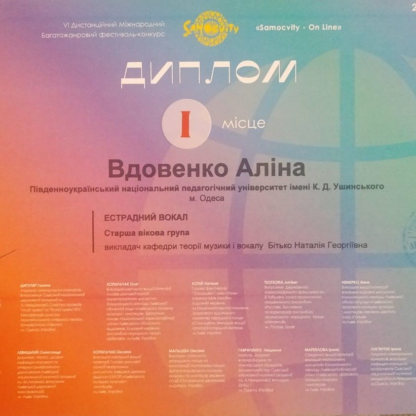 Сердечно вітаємо студентів і викладачів кафедри теорії музики і вокалу: Вдовенко Аліну (викл. Бітько Н. Г.) із званням Лауреата І ступеню двох конкурсів - International Art Festival Contest «Christmas Fest» та VI Дистанційного Міжнародного фестивалю-конкурсу «Samocvitty-On lanе» та Кебуладзе Нателлу (викл. Шафарчук Т. Г.), яка стала Лауреатом ІІ премії на Міжнародному конкурсі «Golden Talents of Madrid 2021».