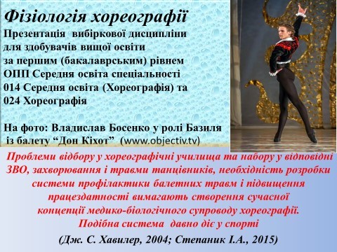 На факультеті музичної та хореографічної освіти Університету Ушинського здійснено нову форму презентації вибіркової дисципліни «Фізіологія хореографії» для здобувачів спеціальностей 014 Середня освіта (Хореографія) і 024 Хореографія в умовах дистанційної форми організації освітнього процесу. Робочу програму означеної вибіркової дисципліни і відео-презентацію підготував і здійснив професор кафедри біології і охорони здоров’я Босенко Анатолій Іванович. Окрім студентів на презентації були присутні викладачі фахових та непрофільних кафедр.