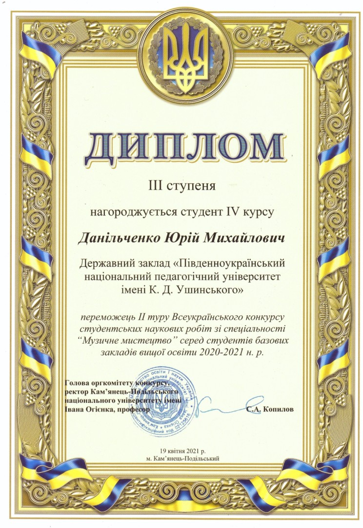 За результатами конкурсу диплом ІІІ ступеня отримав Данільченко Юрій Михайлович, здобувач першого бакалаврського рівня вищої освіти 4 року навчання факультету музичної та хореографічної освіти Університету Ушинського.