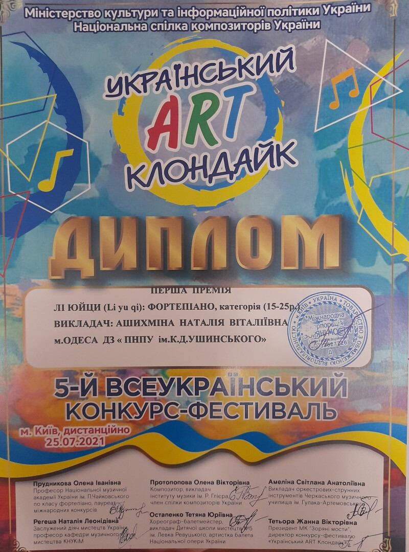 Володаркою двох І премій на Міжнародному фестивалі-конкурсі мистецтв «Fest music-2021» та Всеукраїнському конкурсі-фестивалі «Український АРТ КЛОНДАЙК» в номінації «Інструментальний жанр-фортепіано» стала здобувачка 4 року навчання факультету музичної та хореографічної освіти Лі Юйци.