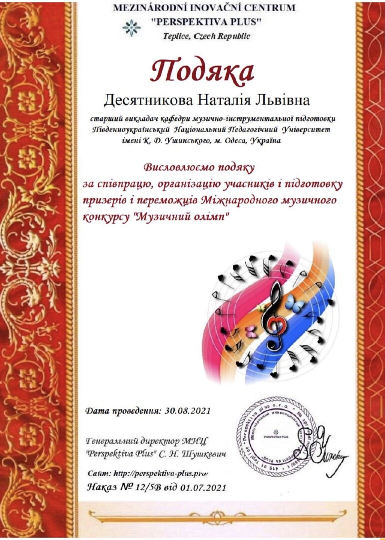 Міжнародний музичний конкурс "Музичний олімп" відбувся в Чехії (м. Тепліце) 30 серпня 2021 року, організатором якого виступив Міжнародний інноваційний центр «PERSPEKTIVA PLUS». Багато виконавців з різних країн світу прийняло участь в цьому яскравому мистецькому змаганні. Україну і наш університет на конкурсі гідно представила студентка факультету музичної та хореографічної освіти Кула Юлія, яка продемонструвала високий рівень виконавської майстерності та отримала почесне 1 місце в номінації «фортепіано» (клас ст. викл. Десятникової Н.Л.). Участь студентів факультету у престижних міжнародних конкурсах та отримання ними призових місць є свідченням творчої взаємодії та співпраці студентів і викладачів, їх наполегливої високопрофесійної роботи.