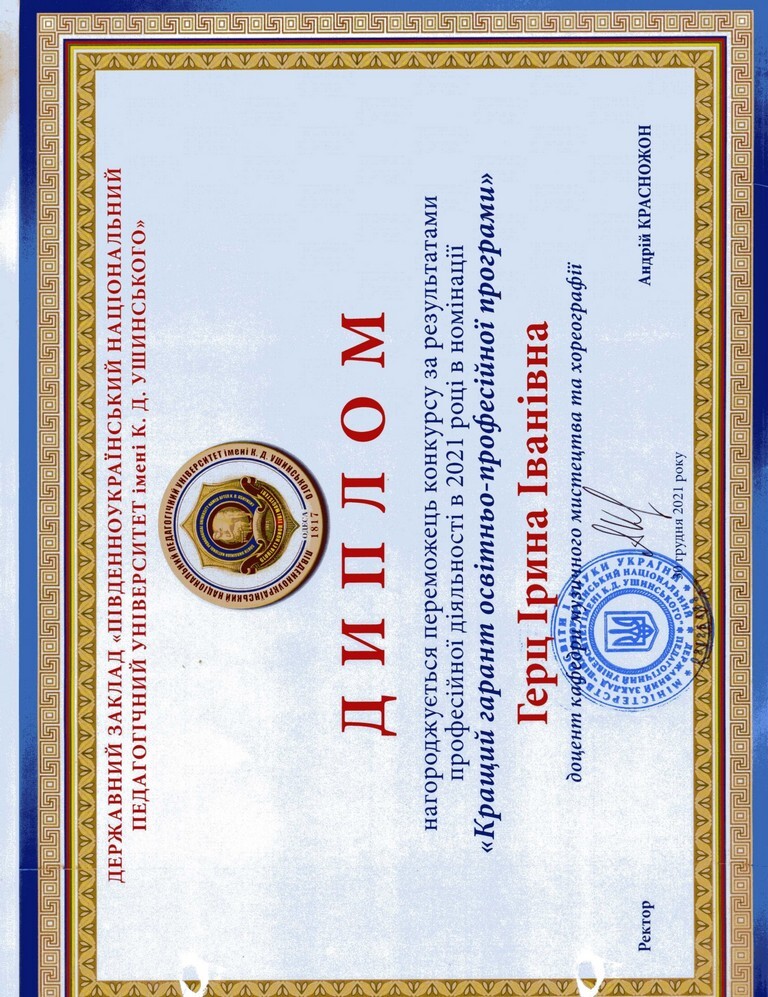 За результатами конкурсу 2021 року у наших викладачів є нові досягнення. Так у номінації «Кращій завідувач кафедри» стала доктор педагогічних наук, професор Олена Євгенівна Реброва – завідувач кафедри музичного мистецтва і хореографії; в номінації «Кращій гарант» - доцент, Заслужений працівник культури України Ірина Іванівна Герц.