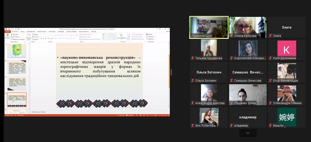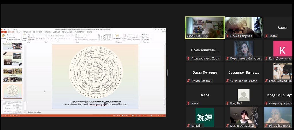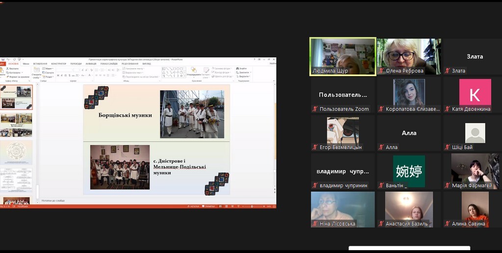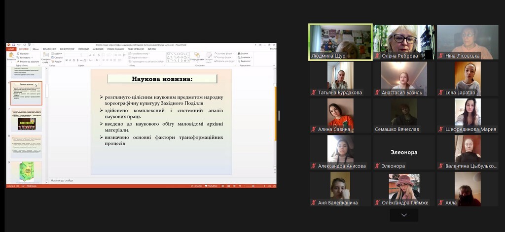 02 лютого 2022 року на кафедрі музичного мистецтва і хореографії відбулася зустріч здобувачів і викладачів з кандидатом мистецтвознавства, викладачем кафедри музикознавства та методики музичного мистецтва Тернопільського національного педагогічного університету імені Володимира Гнатюка, Щур Людмилою Богданівною. Науковець дуже цікаво розповіла присутнім про результати дослідження щодо витоків та здобутків народної хореографії Західного Поділля. Цей пласт народної творчості був мало досліджений науковцями. Було здійснено чимало фольклорних експедицій, записів народних традицій із застосуванням танцювально-музичної творчості мешканців багатьох селищ Тернопільщини. Екскурс в історію краю виявився доречним, коли дослідниця презентувала втілену в народну лексику ментальність різних етносів, що створили цікавий фольклорний продукт − народну хореографію Західного Поділля.