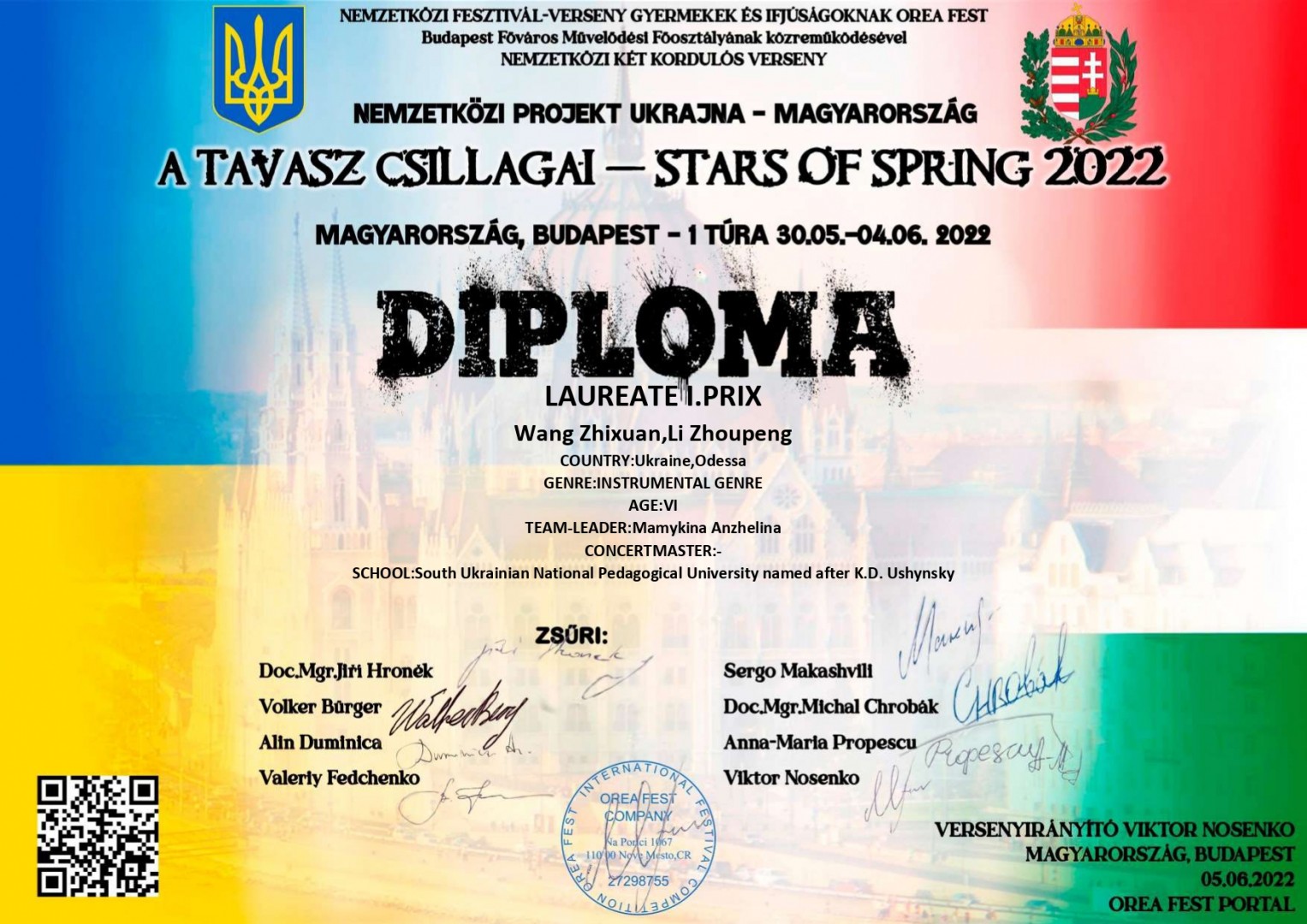 У конкурсному Україно-Угорському проєкті «STARS JF SPRING 2022», що проводився на базі Міжнародного фестивального порталу OREA FEST з 30.05.2022 по 04.06.2022, взяли участь наші студенти. У різних номінаціях вони отримали дипломи лауреатів 1 ступеню.