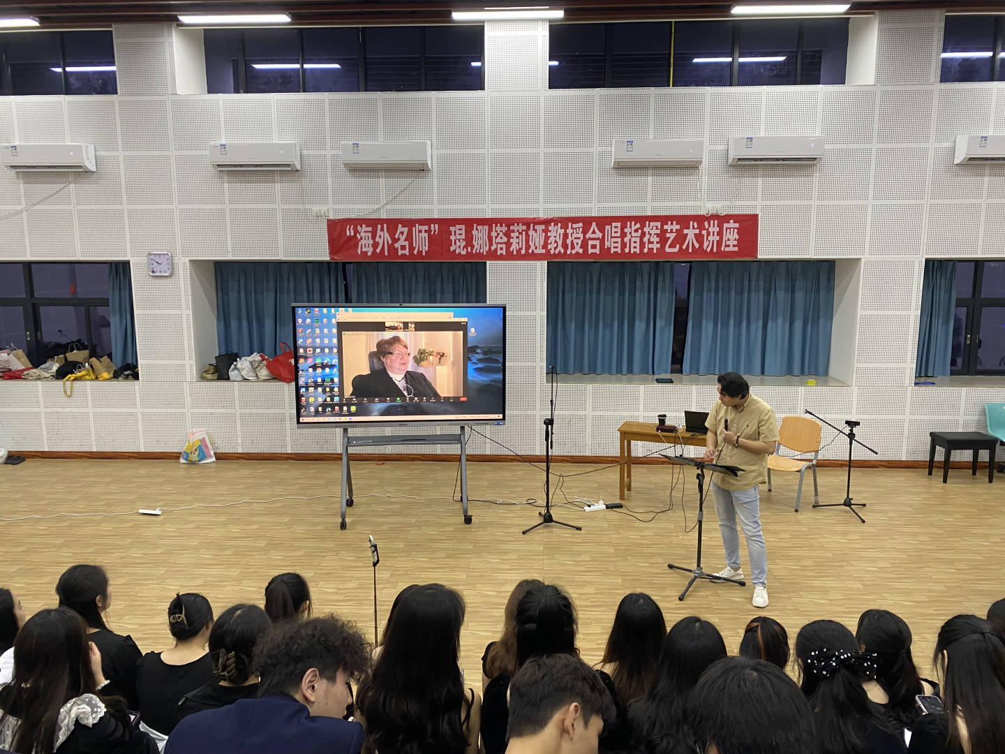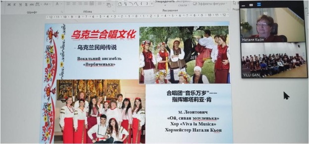 Професор кафедри теорії музики і вокалу Наталя Кьон продемонструвала цикл відеопрезентацій з історії українського хорового мистецтва та інноваційних методів роботи в галузі вокально-хорового мистецтва, а також провела майстерклас із вивчення українського репертуару з хором студентів 1-3 курсів за участю Ма Сюй як диригента хорового колективу.