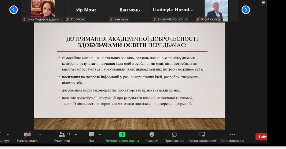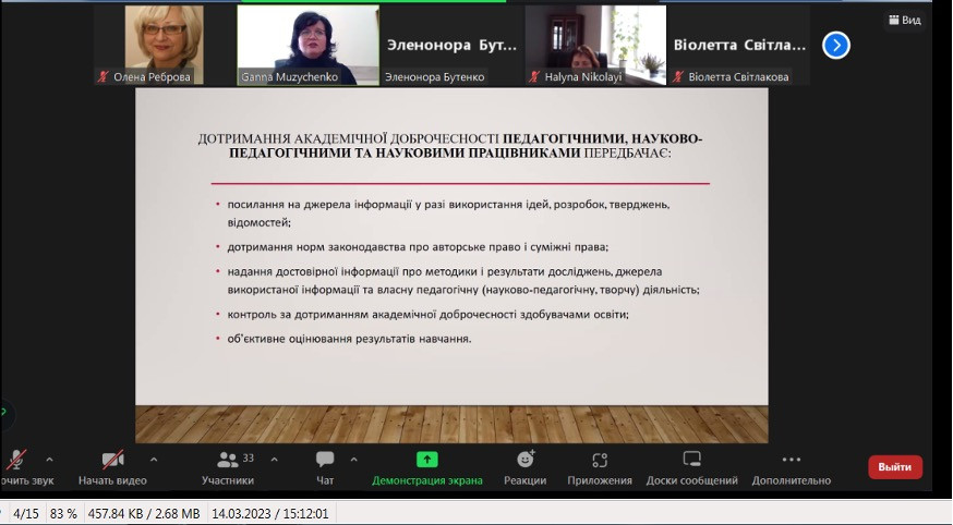 Аспіранти кафедри музичного мистецтва і хореографії спеціальностей 014 Середня освіта (Музичне мистецтво) та 011 ОНП «Мистецька педагогіка вищої освіти» та гаранти зазначених ОНП відвідали лекцію проф. Ганни Музиченко, проректорки з наукової роботи «Нормативний вимір академічної доброчесності в сфері освіти і науки».
