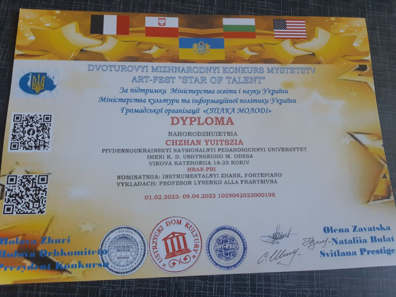 Вітаємо студента факультету музичної та хореографічної освіти Чжан Юйцзя з отриманням почесної нагороди – Гран-прі Міжнародного конкурсу мистецтв ART-FEST «STAR OF TALENT» UKRAINA-POLSHCHA-BOLHARIIA-FRANTSIIA-AMERYKA.