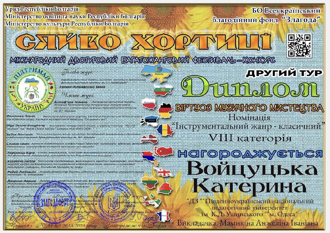 Здобувачка другого (магістерського) рівня спеціальності 025 Музичне мистецтво Войцуцька Катерина отримала Гран-Прі у номінації «Інструментальний жанр-класичний» та додаткову нагороду - диплом «Віртуоз музичного мистецтва» у Міжнародному двотуровому багатожанровому фестивалі-конкурсі «Сяйво Хортиці», який пройшов 22-25 квітня за підтримки Уряду Республіки Болгарія, Міністерства освіти та науки Республіки Болгарія, Міністерства культури Республіки Болгарія.