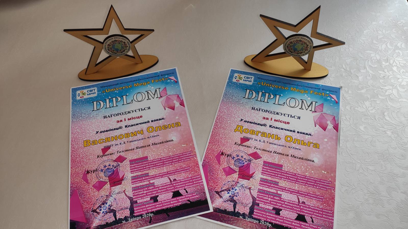 В Міжнародному фестивалі-конкурсі «Universe Mega Fest», який проходив 6-7 квітня в Дніпрі лауреатами І ступеню в номінації «Академічний спів» стали студентки факультету музичної та хореографічної освіти Васянович Олена та Довгань Ольга (клас викл. Толстової Н.М.).