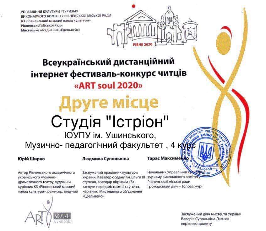 Всеукраїнський дистанційний інтернет-конкурсі читців «ART soul 2020» пройшов 20 травня в м. Рівне. Дипломом лауреата ІІ ступеню нагороджено театральну студію факультету музичної та хореографічної освіти «Істріон» (кер. Савченко-Безверхова О.М.).