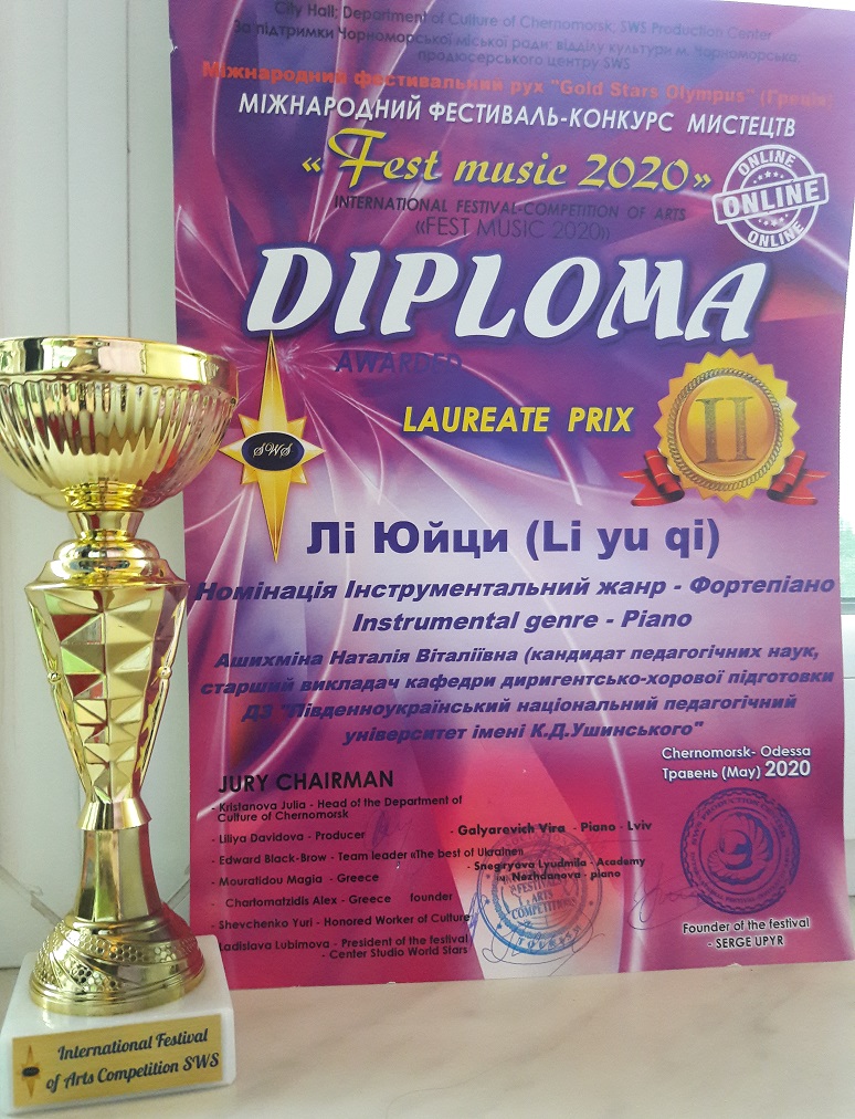 Студентка факультету музичної та хореографічної освіти ПНПУ імені К.Д. Ушинського Лі Юйци стала Лауреатом ІІ ступеню у номінації "Інструментальний жанр (фортепіано)" на Міжнародному фестивалі-конкурсі мистецтв "FEST MUSIC 2020", який пройшов 22-24 травня 2020 року в м.Чорноморськ.