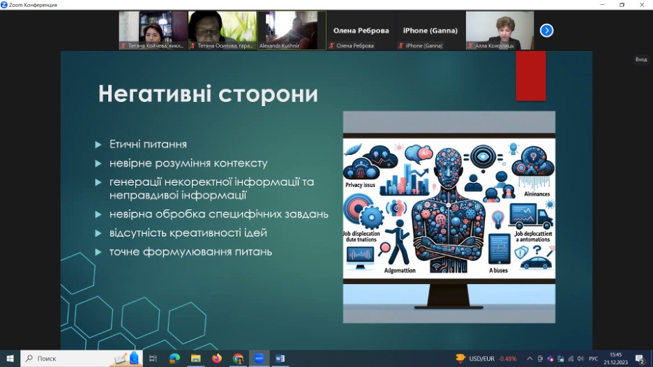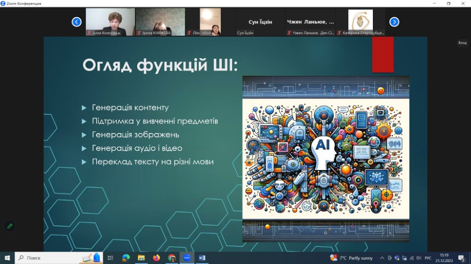 21 грудня 2023 року відбулася гостьова лекція доктора педагогічних наук, професора, проректора з наукової роботи Коломієць Алли Миколаївни та аспіранта Кушнира Олександра Вінницького державного педагогічного університету імені Михайла Коцюбинського за темою «Використання штучного інтелекту в навчанні та наукових дослідженнях».