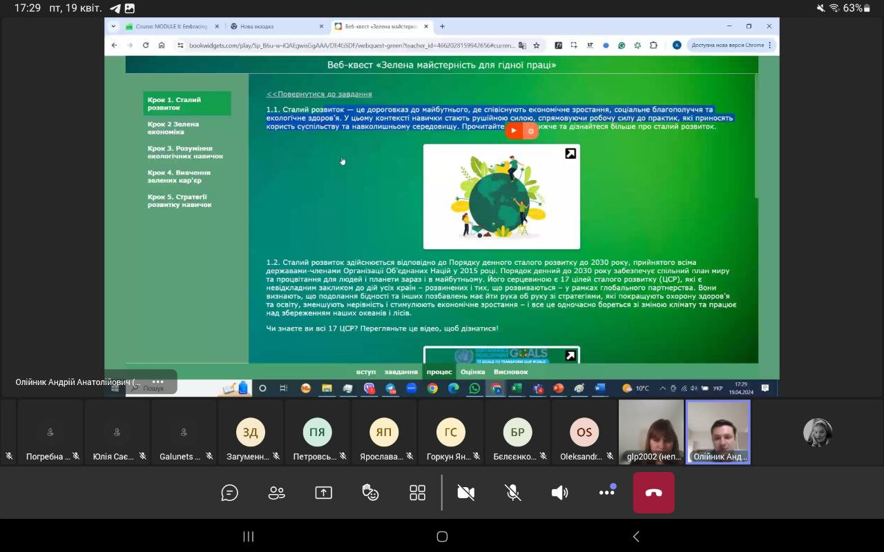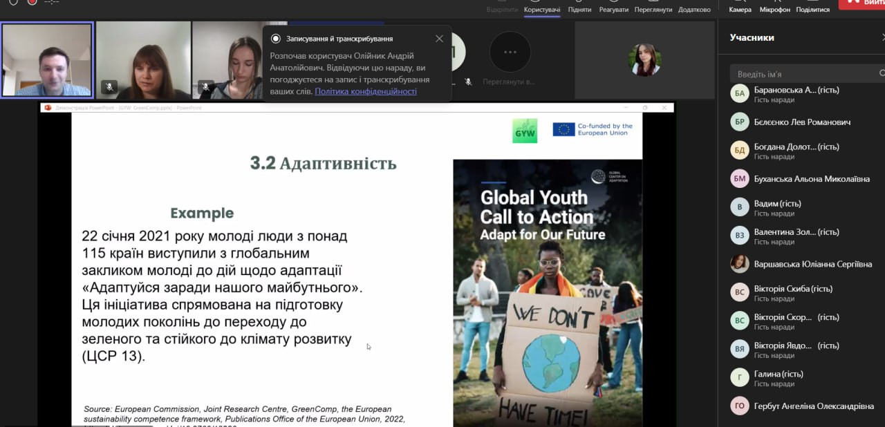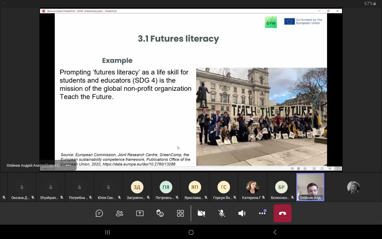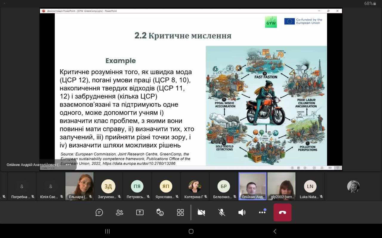 В інтерактивному форматі говорили про те, які зелені навички потрібні для успішного працевлаштування та роботи в процесі переходу до більш «зеленої» та екологічно стійкої економіки; розглядали філософські питання сталого розвитку суспільства. Вітаємо з успішним завершенням програми та отриманням сертифікатів! Результати неформальної освіти всім учасникам будуть зараховані в ОК «Філософія» (як форма самостійної роботи).
