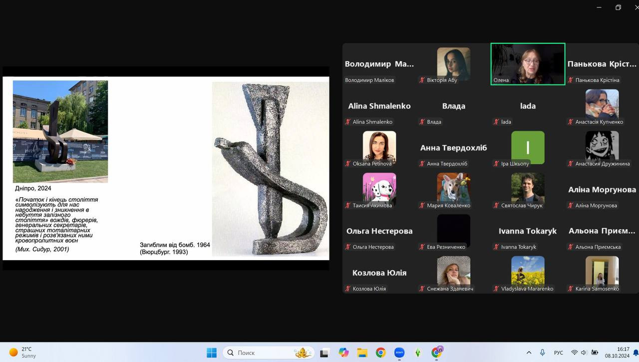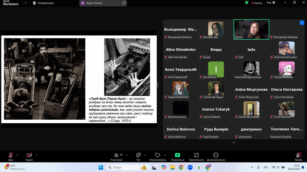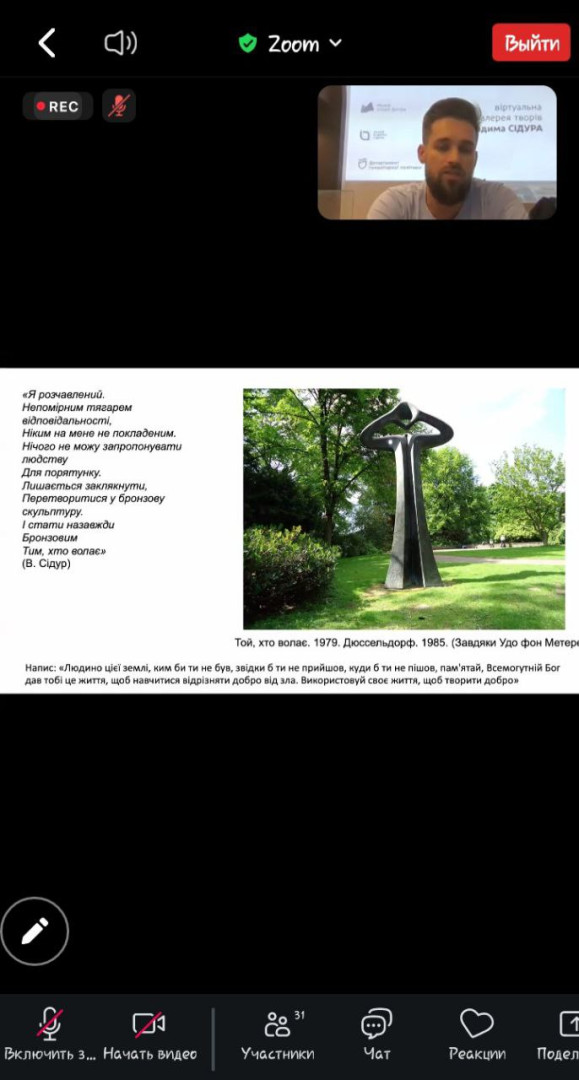 «Я відчуваю себе класиком, що завершує велику епоху….» (Сідур). Відбулася унікальна авторська онлайн-лекція мистецтвознавиці, культурологині, Phd, професорки НТУ «Дніпровська політехніка» (ЗВО-партнер) Олени Годенко-Наконечної «Творчість Вадима Сідура в контексті розвитку світового мистецтва», що проходила в НДЦ «Інститут світової культури», Дніпровська академія музики (ЗВО-партнер), керівниця центру - проф. Юлія Шабанова.Захід організовано в рамках проєкту «Мистецтво пам’ятати». Послухати унікальну інформацію та прийняти участь в обговоренні доєдналися також і студенти 1го року навчання ОПП «Початкова освіта», члени студентського наукового гуртка «Південноукраїнські наукові студії» разом із викладачем філософії проф. Оксаною Петіновою, керівницею гуртка. Лекція, присвячена життю та творчості видатного дніпровського скульптора, стала важливою подією для всіх, хто цікавиться мистецтвом, філософією мистецтва та соціокультурними процесами. У своєму виступі Олена детально розкрила особливості творчого шляху митця, торкнулася теми його непростої долі та представила глибокий аналіз новаторських робіт. Обговорювали скульптури, що поєднують архаїчні форми та модерністські ідеї, створюючи унікальні візуальні образи, архаїчні мотиви як джерело натхнення митця та роль цієї естетики в творчості Вадима Сідура, надзвичайно вразило присутніх мистецтво "Гроб-арт" як новаторський напрям, що викликає емоційний резонанс і змушує замислитися про життя, смерть і вічність.