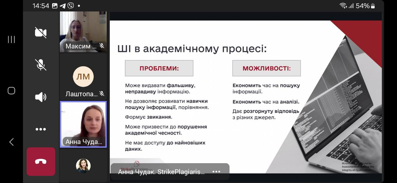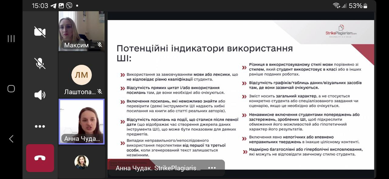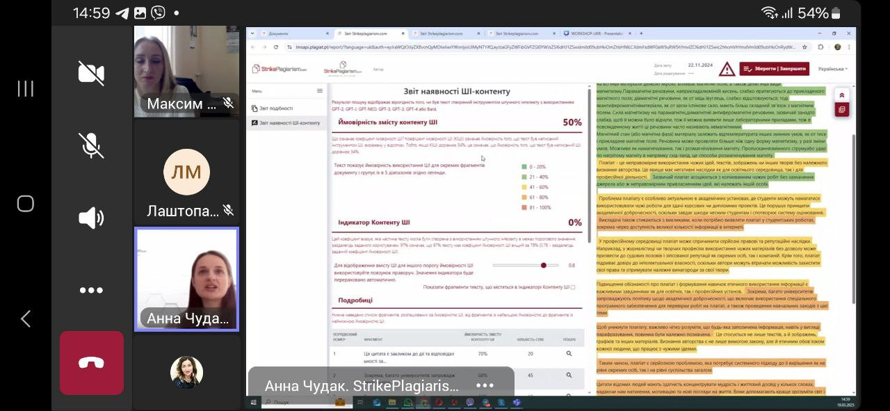 19 березня 2025 року здобувачі 4-го року навчання спеціальності 013 «Початкова освіта» заочної форми навчання долучилися до вебінару «Перевірка на плагіат як інструмент академічної доброчесності: аналіз звіту подібності + КП ШІ у StrikePlagiarism.com». Захід відбувся в межах «Тижня доброчесності в Університеті Ушинського» та є дотичним до розгляду теми «Соціальні інститути освіти та їх роль у формуванні академічної культури» (ВК «Соціологія», викладач – проф. Петінова О. Б.).Говорили про розуміння етичних стандартів написання наукових робіт; аналізувати критерії оцінки тексту; знайомились з алгоритмами роботи StrikePlagiarism.com та штучного інтелекту в перевірці запозичень. Учасники отримали практичні навички роботи із системою StrikePlagiarism.com, роз’яснення щодо оцінки текстів на плагіат та використання штучного інтелекту для перевірки доброчесності робіт. Захід розпочався з вітального слова Оксани МАКСИМ, директорки бібліотеки, Голови Групи сприяння доброчесності в Університеті Ушинського, яка наголосила на важливості академічної доброчесності в освітньому процесі. Спікерка – Анна ЧУДАК, менеджер з розвитку plagiat.pl (https://plagiat.pl/) в Україні. Активна дискусія підкреслила важливість таких заходів для формування культури доброчесності серед здобувачів вищої освіти. Активну участь в обговоренні теми взяли Клименко Марина, Лаштопа Анна, Романова Дарія, Мединська Ольга. Академічна доброчесність – основа якісної освіти та наукової діяльності!
