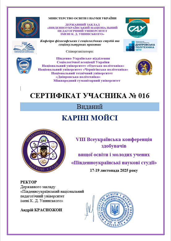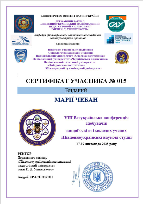Вітаємо здобувачів першого (бакалаврського) рівня вищої освіти спеціальності «Початкова освіта» з успішним виступом на VIII Всеукраїнській конференції здобувачів вищої освіти і молодих учених «Південноукраїнські наукові студії», яка відбулася 17–19 листопада 2025 року в Університеті Ушинського. Це одна з найочікуваніших наукових подій академічної осені, організована кафедрою філософських і соціологічних студій та соціокультурних практик. Серед співорганізаторів: Південно-Українське відділення Соціологічної асоціації України, Національний університет «Одеська політехніка», НУ «Чернігівська політехніка», НТУ «Дніпровська політехніка» та Міжнародний гуманітарний університет. Захід проходив у змішаному форматі та об’єднав активних, допитливих і творчих учасників з усіх куточків України. Упродовж трьох днів панувала атмосфера живого інтелектуального спілкування, насичених дискусій і яскравих дослідницьких презентацій.