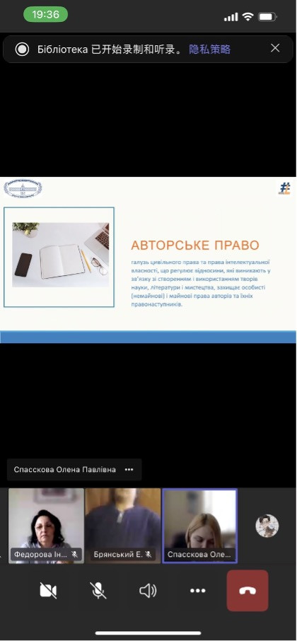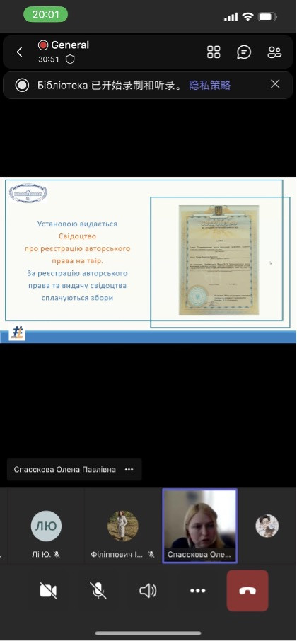 Директор бібліотеки Олена Спасскова розповіла про реєстрацію авторського права на науковий твір, а також були розглянуті питання основних термінів законодавства про авторське право та порушена тема підписання документів кваліфікованим цифровим підписом.