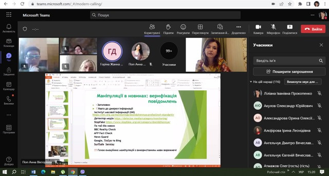 9 червня 2023 року на історико-філологічному факультеті пройшов майстер-клас від кандидата педагогічних наук, доцента кафедри української філології і методики навчання фахових дисциплін Горіної Жанни Дмитрівни «Як не загубитися у вирії інформації&дезінформації?».