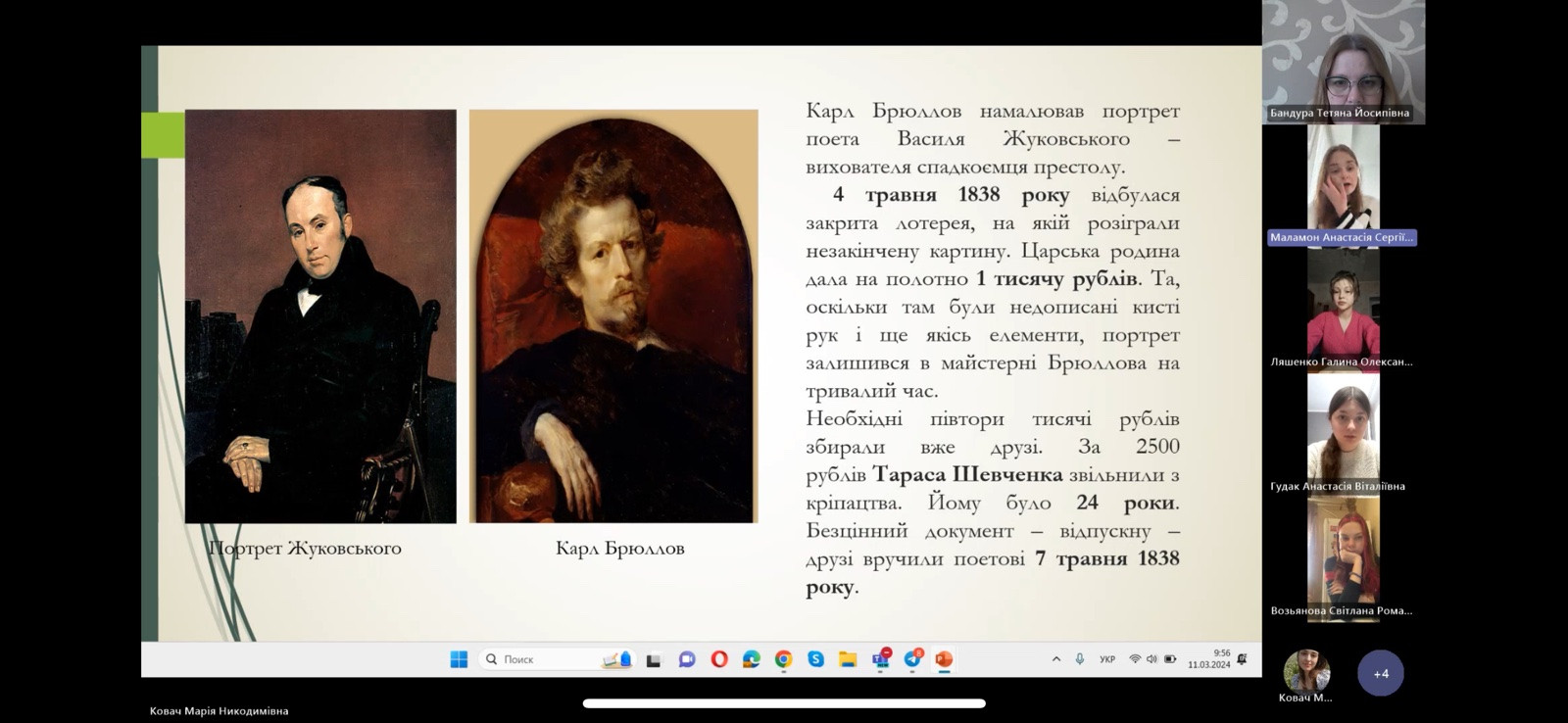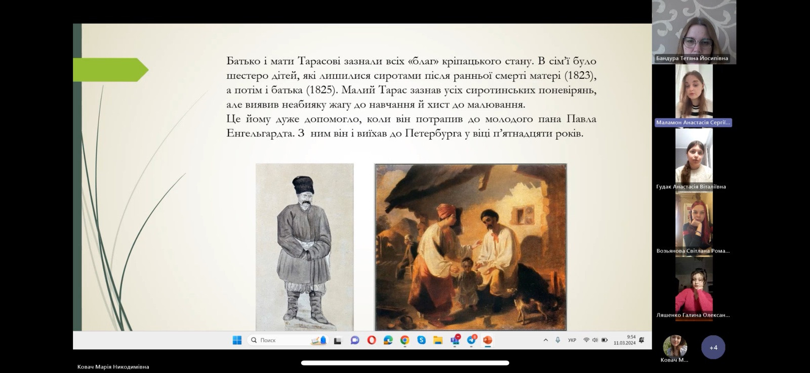 11 березня 2024 року студентками 1 групи 3-го курсу історико-філологічного факультету й куратором Бандурою Т. Й. було проведено онлайн-семінар «Стежками Шевченкової творчості». Цим заходом учасники вшанували пам'ять Великого Кобзаря з нагоди 210-річчя від дня народження митця.Студентки-філологині продемонстрували глибоку повагу генієві Шевченка, підготувавши змістовну презентацію про різножанрову творчість письменника, його малярський здобуток. Юні пошановувачки таланту поета декламували вірші, показуючи неабияке вміння передати емоцію, переживання, відчуття ліричного героя шевченківської поезії. Таким чином організатори й учасники зробили свій внесок у свідомий акт національної й патріотичної самоідентифікації, рупором ідей якої був саме Тарас Григорович Шевченко – честь і гордість українського народу.