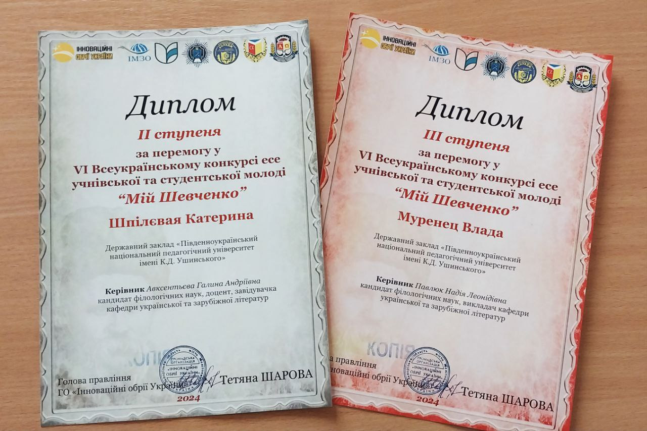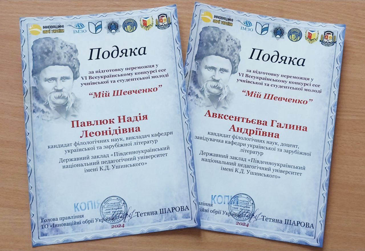 19 березня на історико-філологічному факультеті відбулося нагородження переможців VI Всеукраїнського конкурсу есе учнівської та студентської молоді «Мій Шевченко», який було організовано Державною науковою установою «Інститут модернізації змісту освіти» спільно з Громадською організацією «Інноваційні обрії України». Декан факультету Кон О.О. вручила дипломи 2 ступеня студентці 3 курсу Шпілєвій Катерині та 3 ступеня студентці 1 курсу Муренец Владі. Також подяками було відзначено керівників - завідувача кафедри української та зарубіжної літератур, доцента, к.філол.н. Авксентьєву Г.А. та викладача кафедри української та зарубіжної літератур, к.філол.н. Павлюк Н.Л.