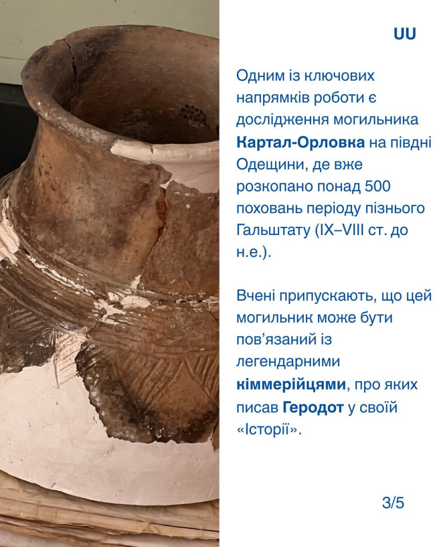Зокрема, значна увага приділяється дослідженню артефактів, знайдених на території могильника Картал-Орловка (IX–VIII ст. до н.е.), що пов’язаний із культурою кочових кіммерійців. Ці матеріали дозволяють не лише вивчати давню історію нашого регіону, а й робити важливі наукові відкриття.