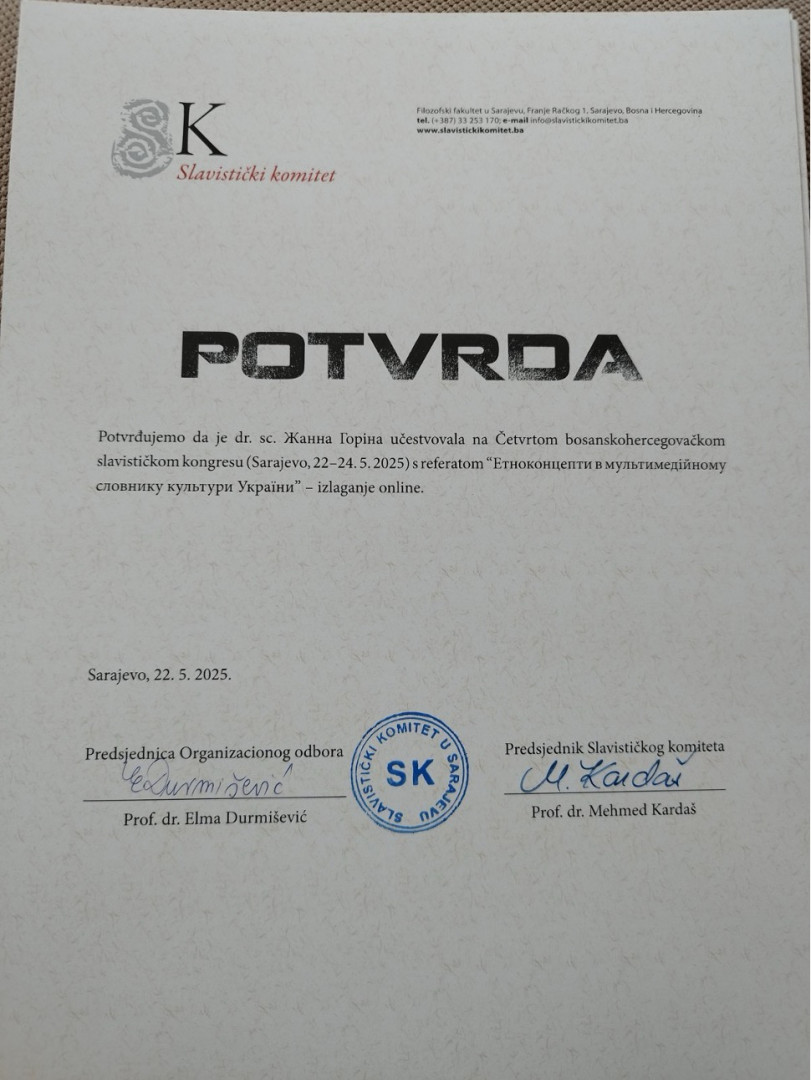 З 22 по 25 травня в Сараєво відбулася масштабна наукова зустріч - IV Конгрес славістів, організована слов’янським комітетом Боснії і Герцоговіни, в якому, крім шістьох українських дослідників, взяли участь науковці з Австрії, Чехії, Італії, Чорногорії, Хорватії, Польщі, Сербії, Словакії, Норвегії тощо. (відео відкриття Конгресу славістів https://www.youtube.com/watch?v=qc6_HK8fKfQ )