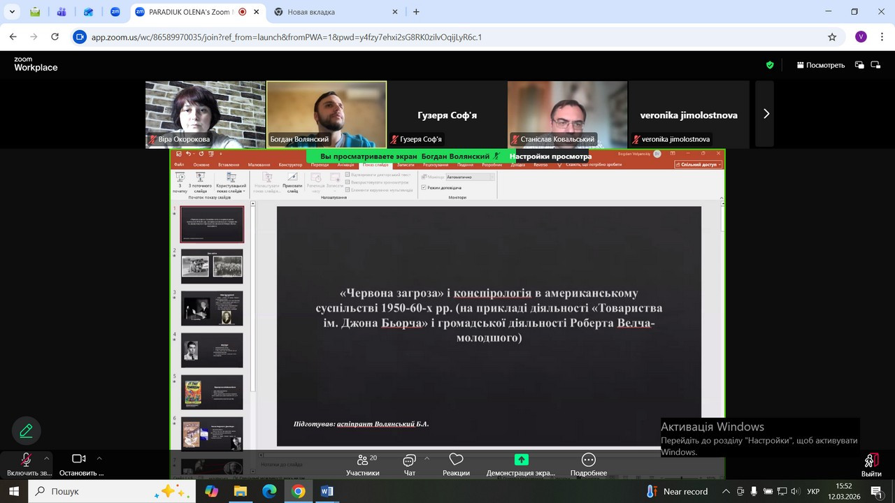 - Волянський Б. «Червона загроза та конспіралогія в американському суспільстві 1950-60-тих років (на прикладі діяльності товариства імені Джона Бьорча» та громадської діяльності Роберта Велча)». Аспірант кафедри всесвітньої історії та методики її навчання Державного закладу «Південноукраїнський національний педагогічний університет імені К. Д. Ушинського.